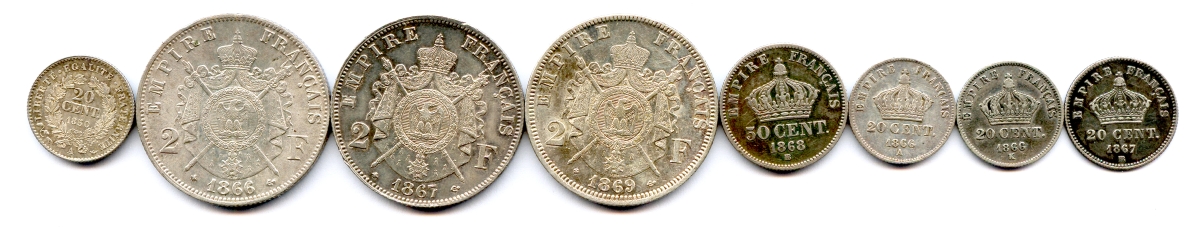 Lot de huit monnaies en argent : 20 cent. République (type Cérès) 1850 Paris; 2 Francs Napoléon III 1866 Paris, 2 Francs 1867 Paris, 2 Francs 1869 Strasbourg, 50 cent. 1866 Strasbourg, 20 cent. 1866 Paris et Strasbourg, 20 cent. 1867 Strasbourg.