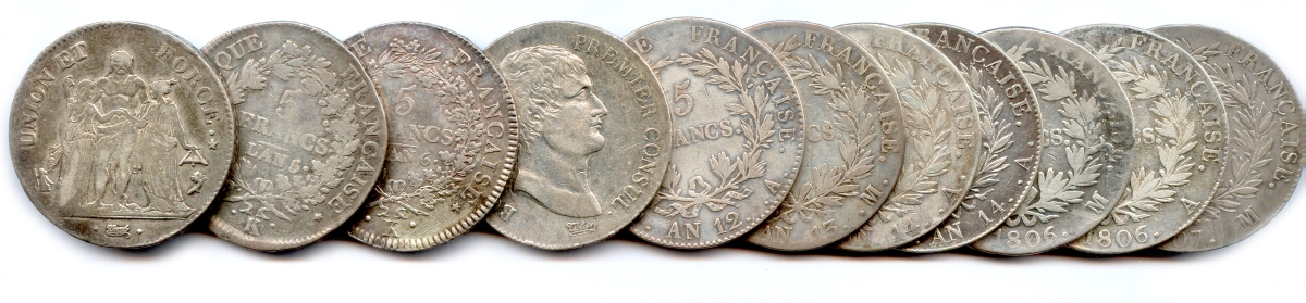 Lot de onze pièces argent 5 Francs Union et Force, Consulat et Ier Empire : an 4 Paris, an 5 et an 6 Strasbourg, an XI Paris, an 12 Paris, an 13 Toulouse, an 14 Paris (2p.), 1806 Paris et Toulouse, 1807 Toulouse.