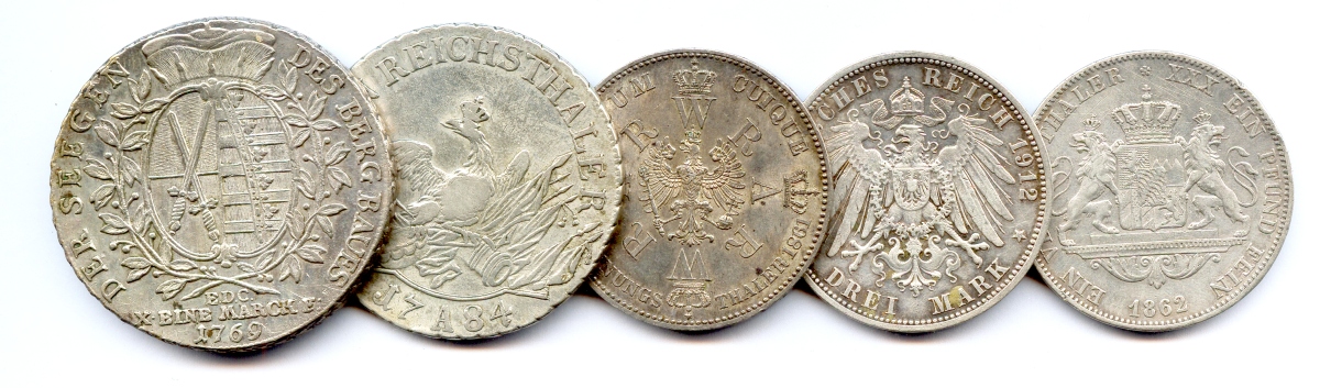 Lot de cinq monnaies allemandes en argent : Thaler 1769 Frédéric Auguste de Saxe (1763-1827), Reichthaler 1784 A Frédéric de Prusse (1740-1786), Vereinstaler 1864 Berlin Guillaume et Augusta de Prusse (1861-1888), Verinstaler 1862 (très endommagé) Maximilien II Bavière (1848-1864), Drei mark 1912 Guillaume II de Prusse (1888-1918).