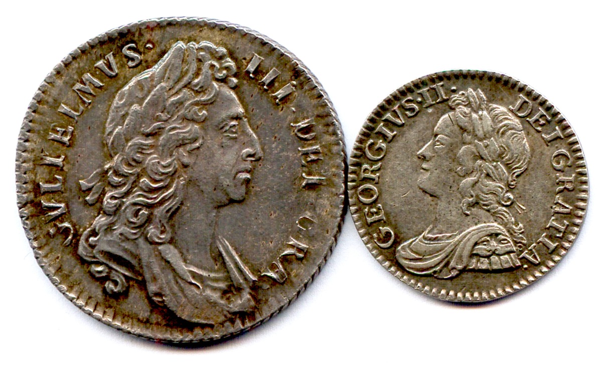 Lot de deux monnaies d'argent de Grande Bretagne : Schilling de Guillaume III (1694-1702) et 4 pence de George II (1727-1760).