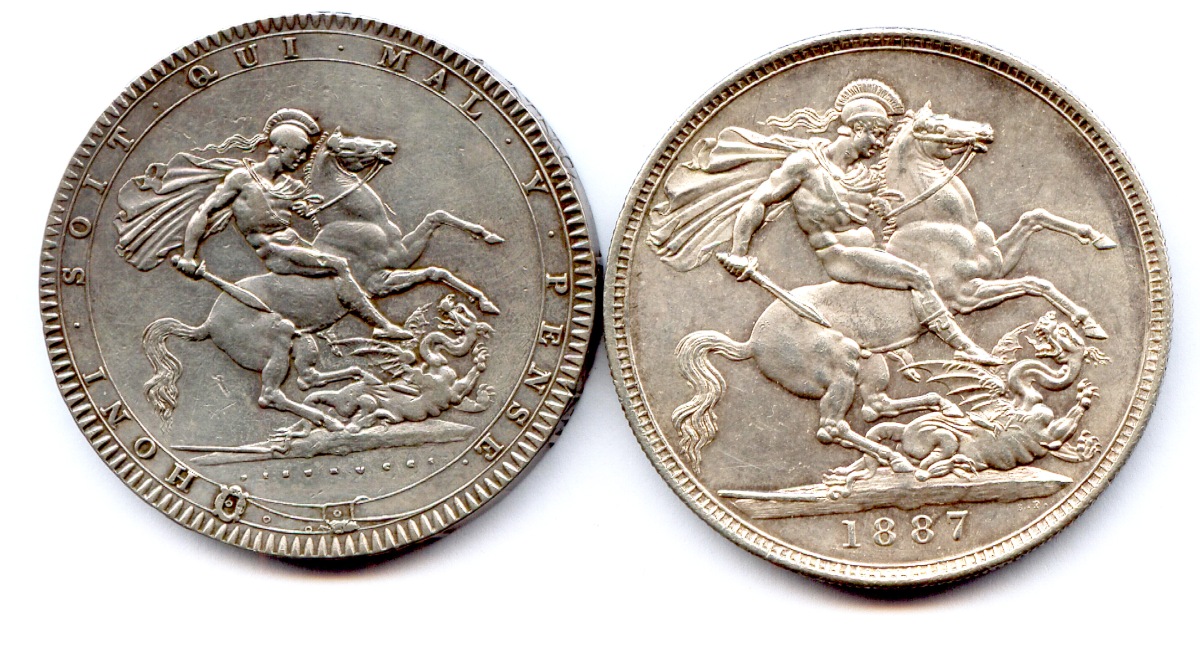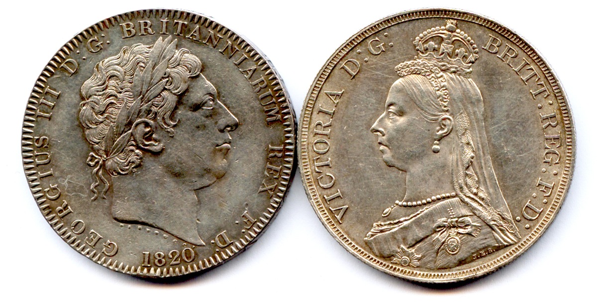 Lot de deux monnaies d'argent de Grande Bretagne : Couronne...