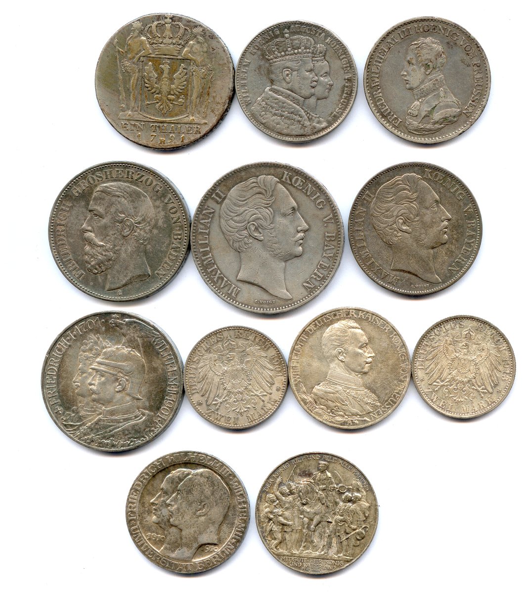 Thaler Frédéric Guillaume de Prusse 1791, demi-thaler Frédéric et Augusta 1861, Thaler Frédéric Guillaume III de Prusse 1818, 5 Mark Frédéric de Bade 1876, double thaler Maximilien II de Bavière 1855, double gulden Maximilien de Bavière 1855, 5 Mark et 2 Mark de Frédéric et Guillaume II du bicentenaire du royaume de Prusse 1901, 3 Mark et 2 Mark de Guillaume II de Prusse 1913, 3 Mark 100e anniversaire de lUniversité de Berlin 1910, 3 Mark Guillaume II de Prusse 1913.
