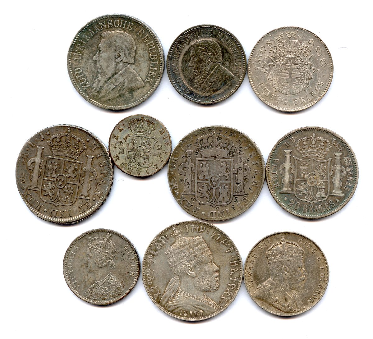 8 reales Charles IV 1797 avec de nombreuses contremarques chinoises, 20 reales Isabelle II dEspagne 1862, Birr (Talari) Ménélik II Ethiopie, one rupee Inde Victoria 1875, one dollar Malaisie Edouard VII 1907.