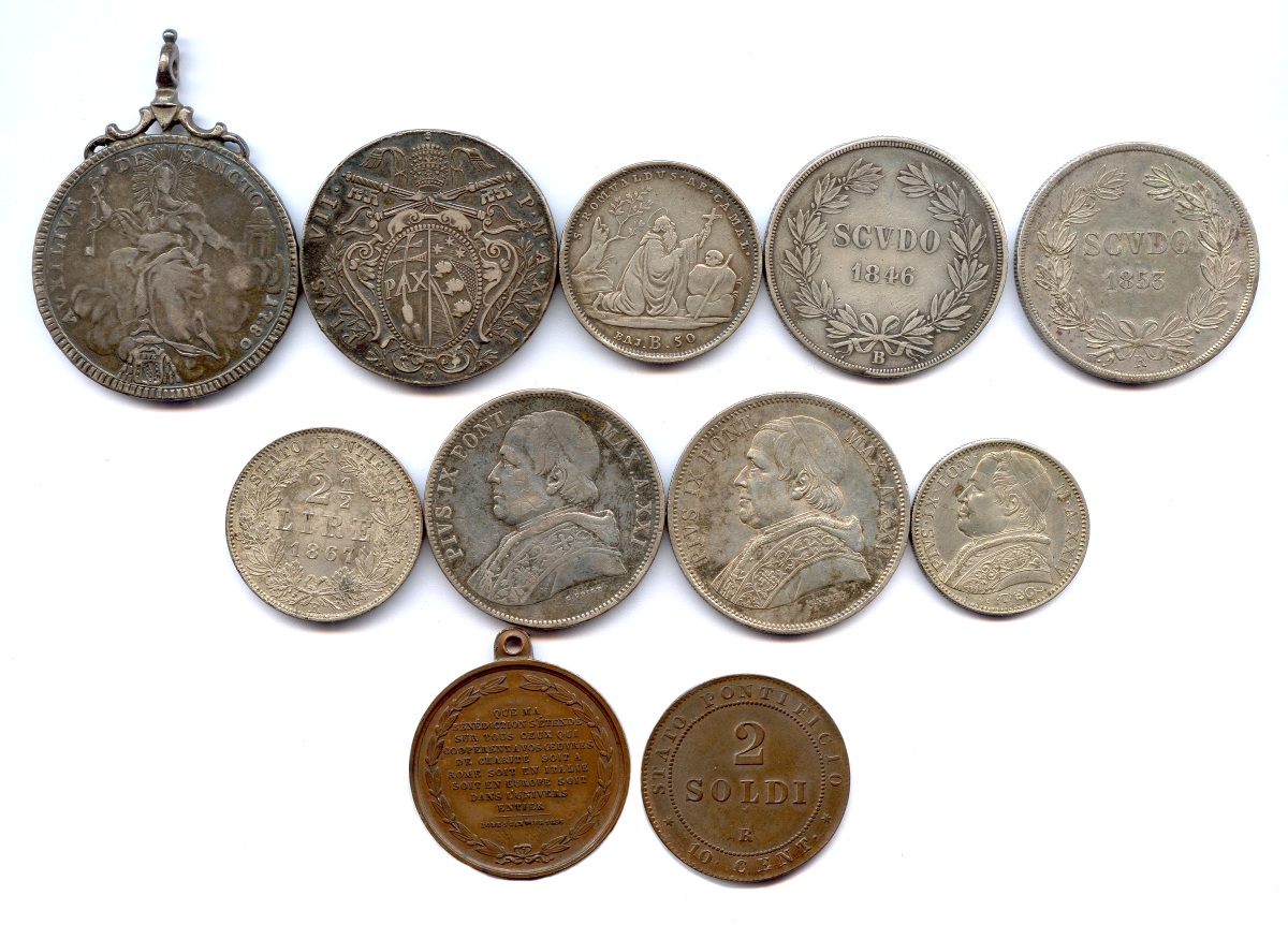 On joint une médaille en cuivre de Pie IX et une pièce 2 soldi (10 cent.) 1866 Rome.