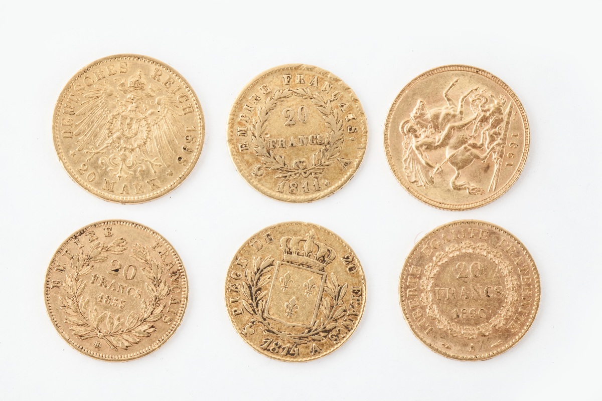 4 pièces de 20 francs or. Napoléon Empereur lauréé (Paris, 1811), Louis XVIII (Paris, 1814), Napoléon III Empereur tête nue (Strasbourg, 1855), Génie (Paris, 1890).