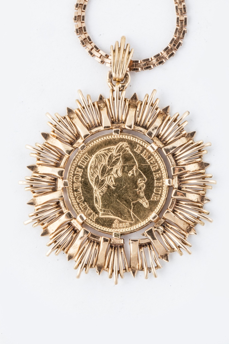 MÉDAILLON PENDENTIF en or jaune serti d'une pièce de 20 francs or figurant Napoléon III lauréé(1866), dans un entourage rayonnant. Chaîne or à mailles tank.