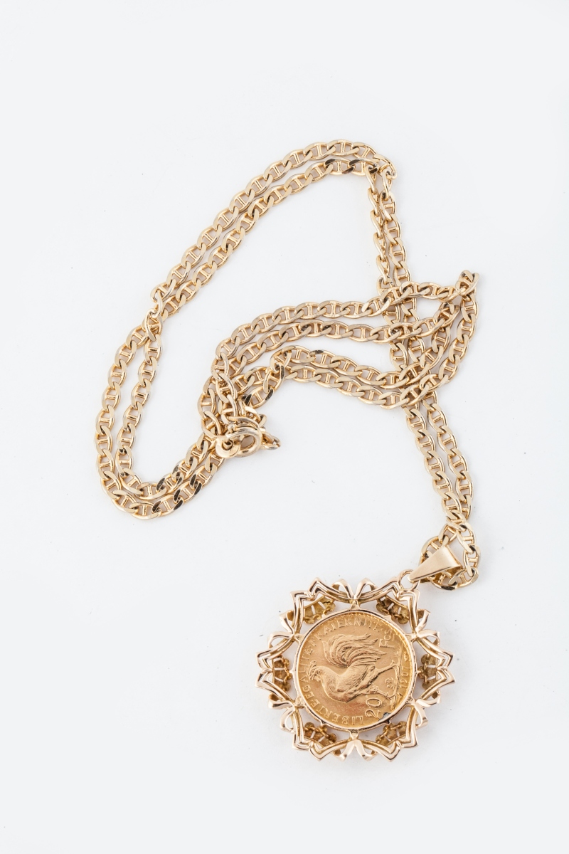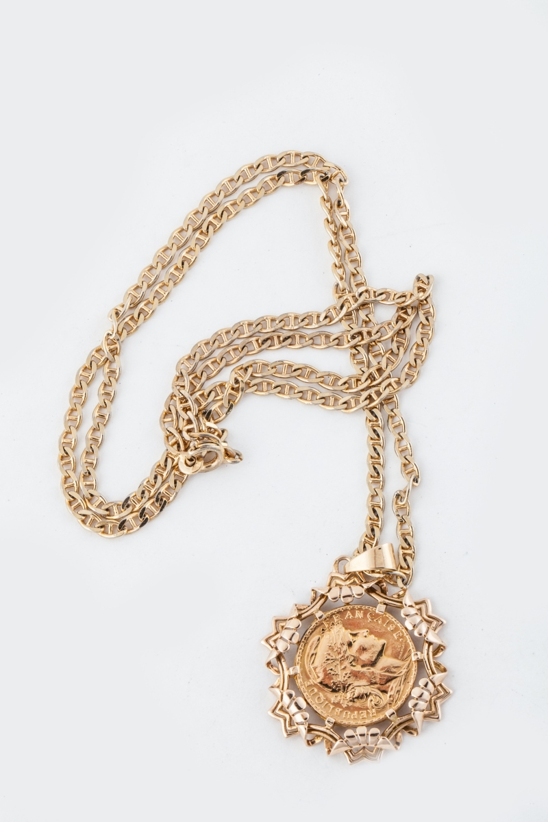 MÉDAILLON PENDENTIF en or jaune serti d'une pièce de 20 francs or au coq (1907). Chaîne en or à maille marine.