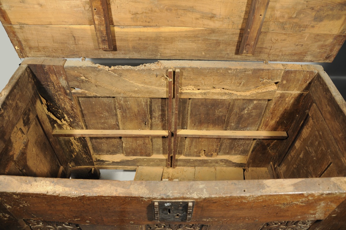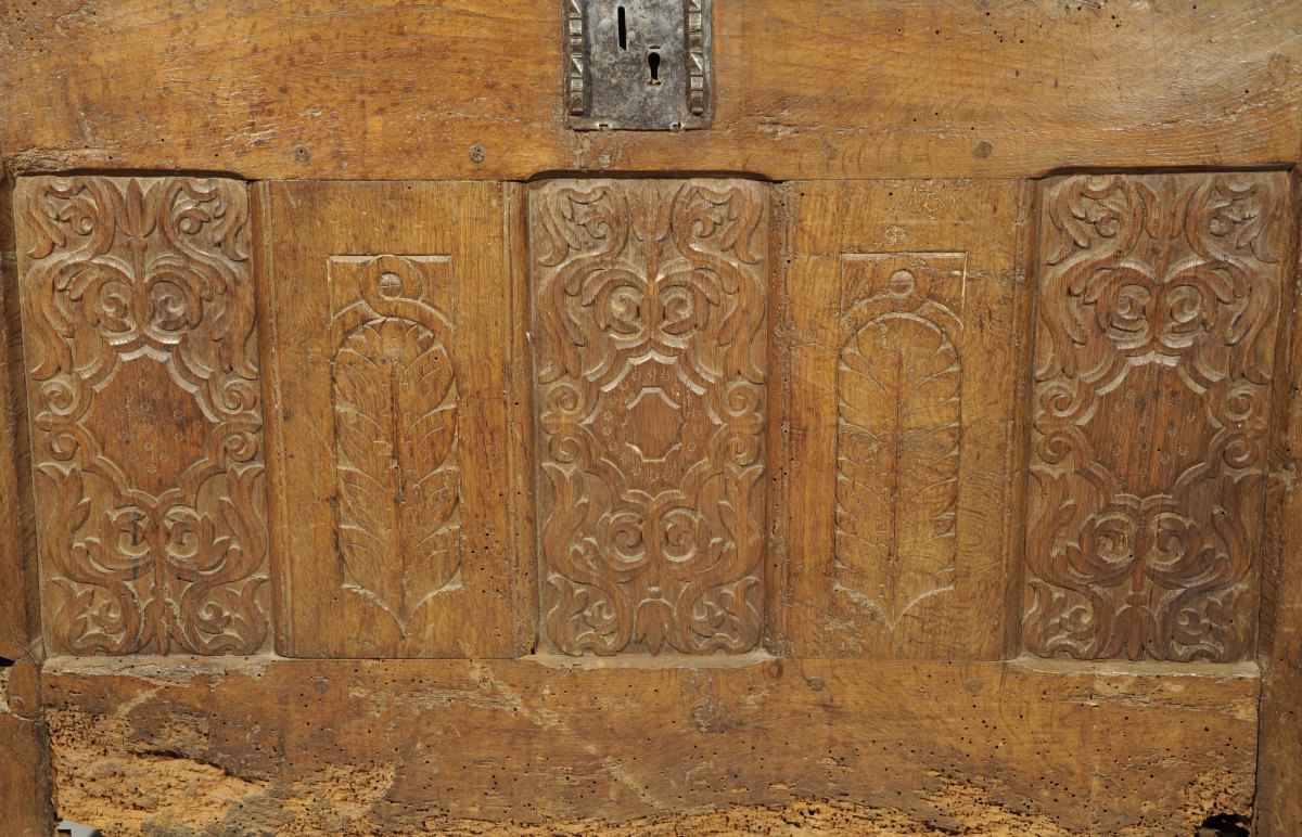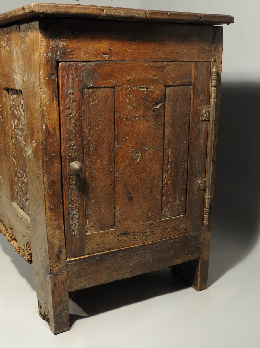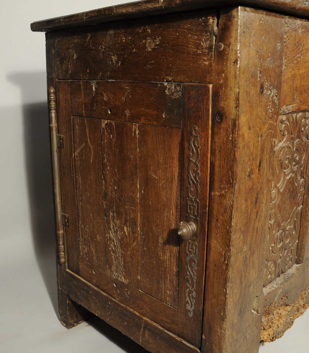 COFFRE en noyer sculpté en façade de feuilles d'acanthe stylisées et de palmettes. Ouvrant par une porte sur le côté.