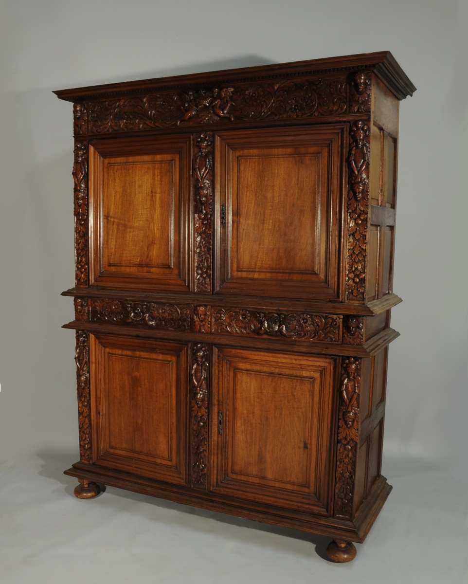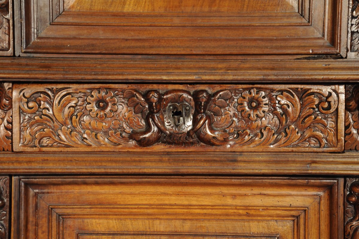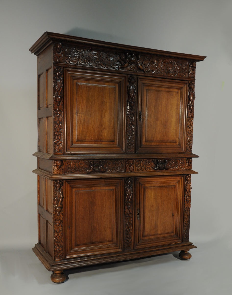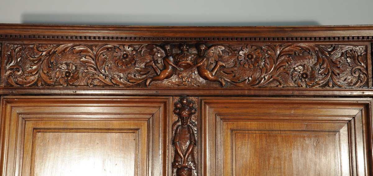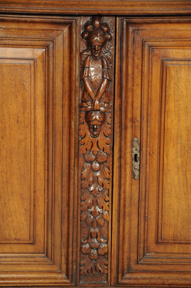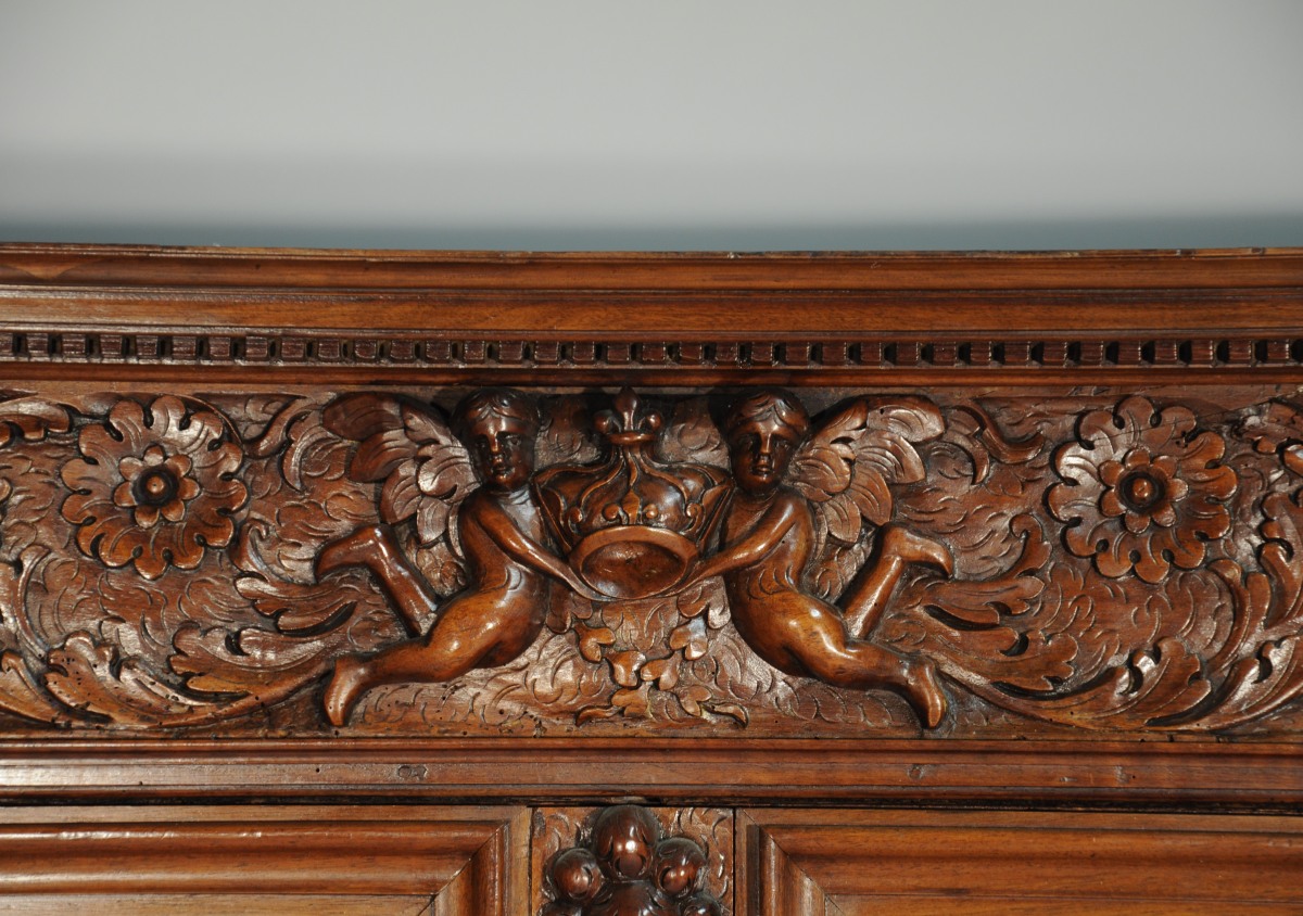BUFFET DEUX CORPS en noyer mouluré et sculpté. Il ouvre en façade par quatre vantaux et deux tiroirs en ceinture. La traverse haute centrée d'une couronne royale soutenue par deux anges flanqués de fleurs et d'acanthes stylisées. Les tiroirs reçoivent un décor similaire mais dépourvu de couronne. Les montants et faux-dormants ornés de cariatides empanachées portant un masque humain prolongé de guirlandes de feuilles et de fruits. Les côtés ornés de quatre panneaux moulurés. Repose sur deux pieds antérieurs en boule aplatie et deux pieds postérieurs droits.