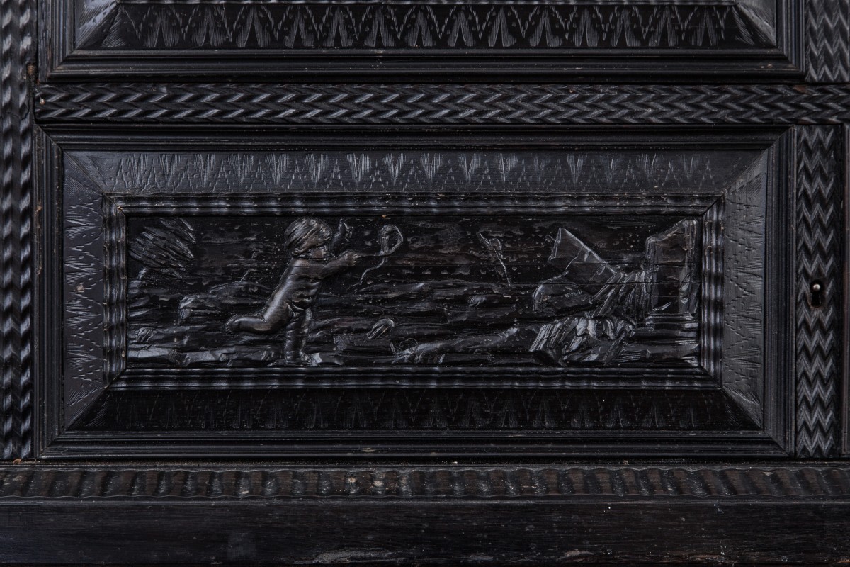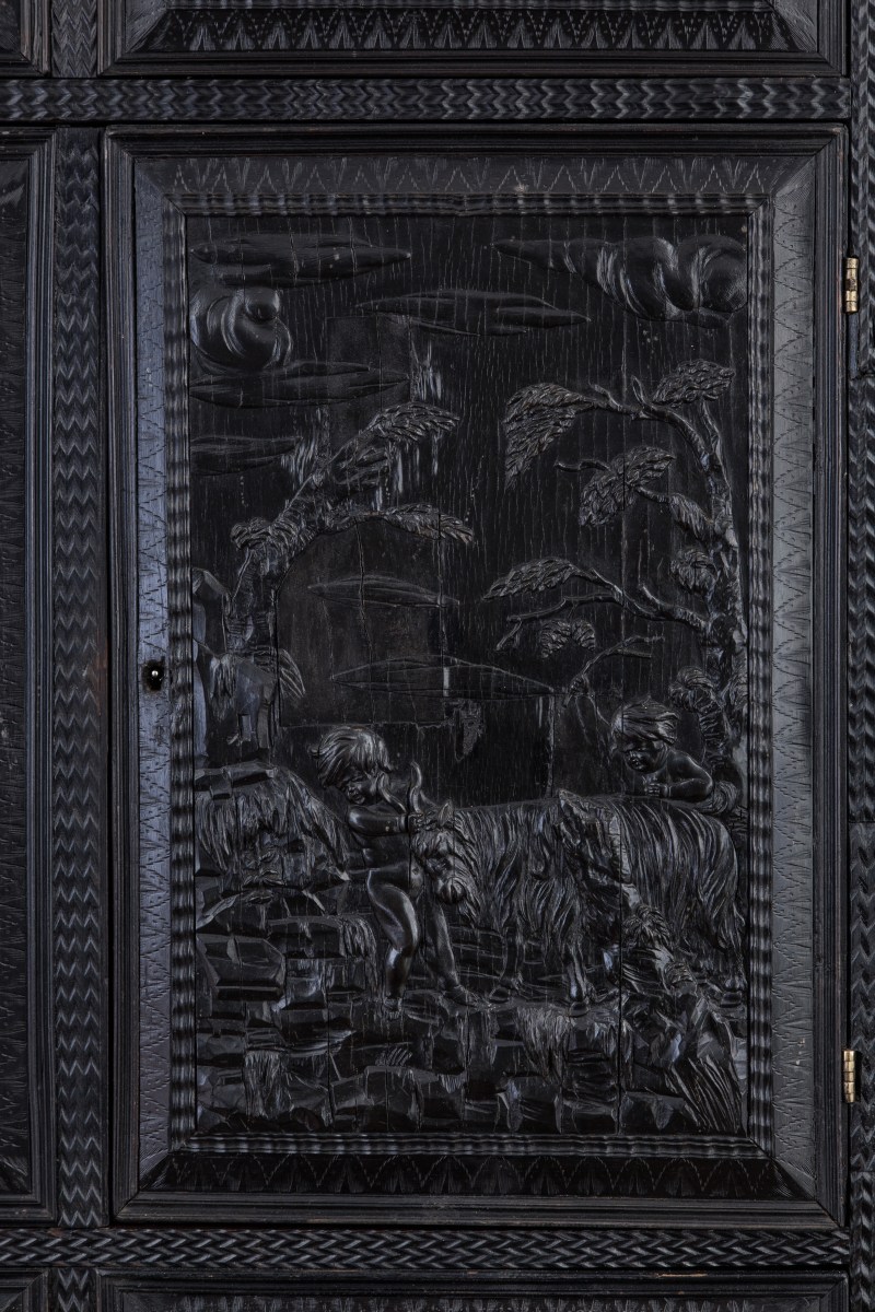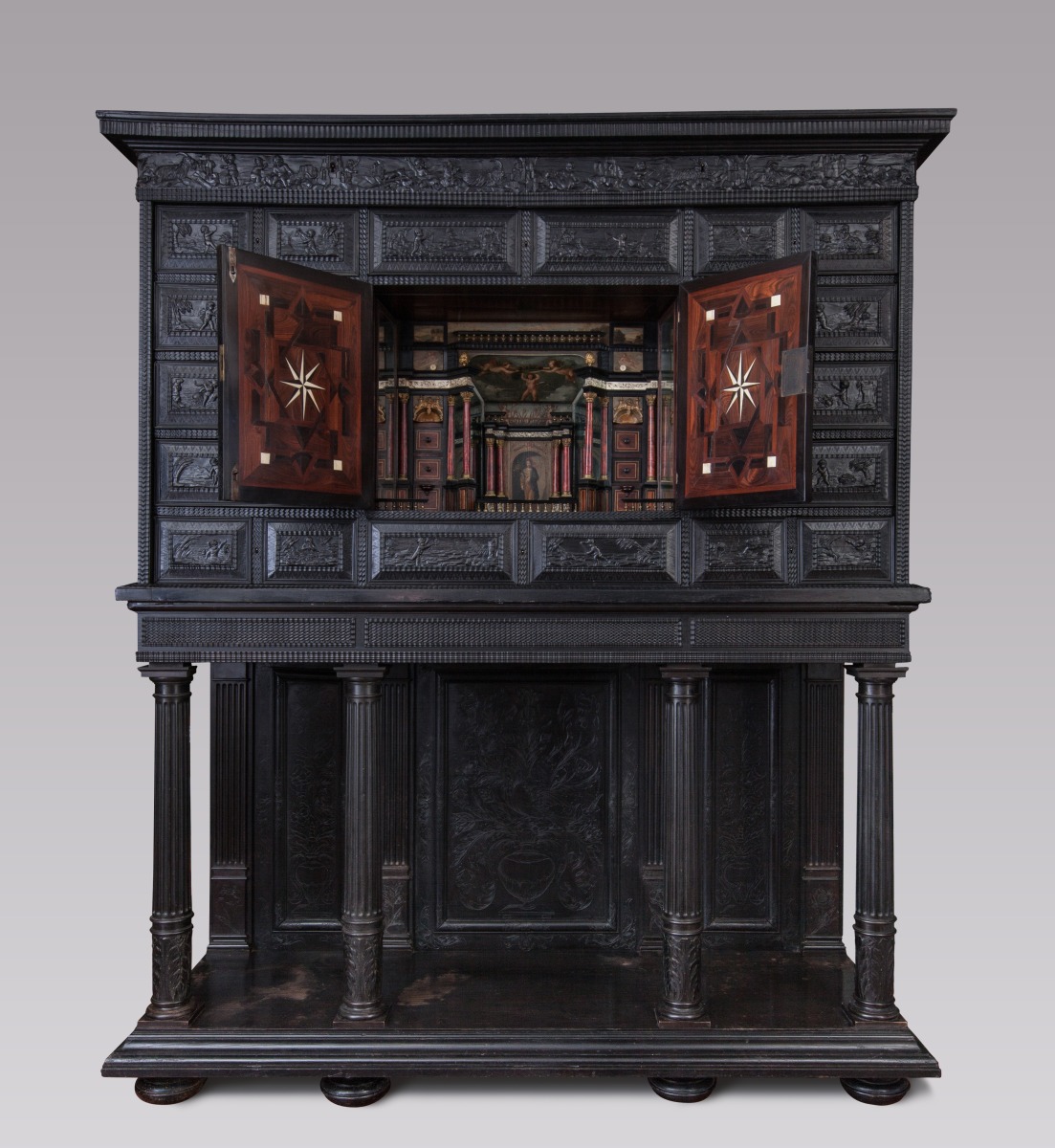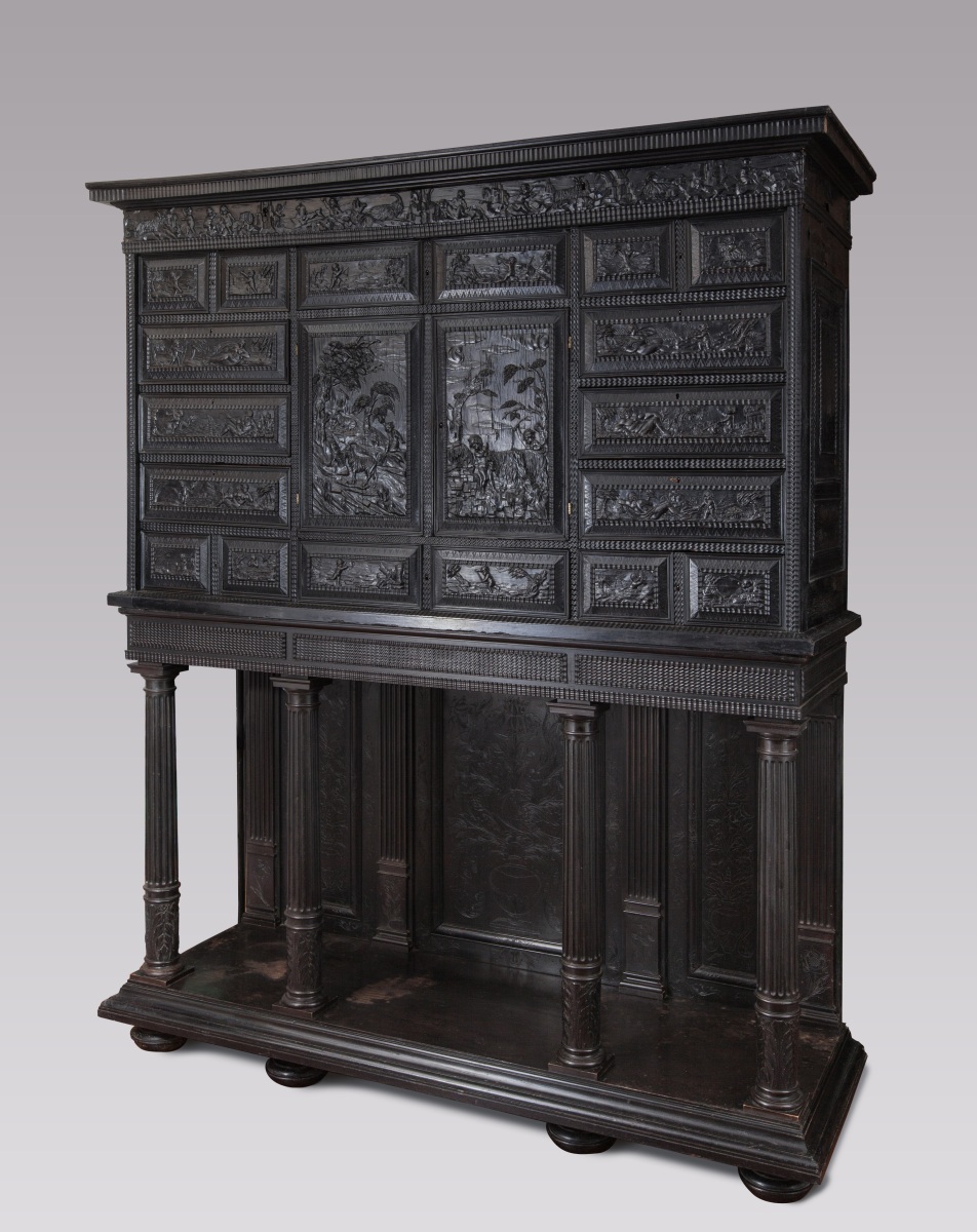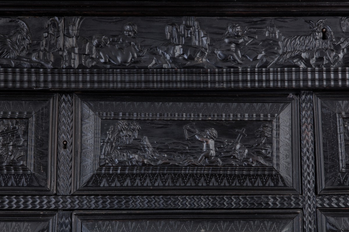 CABINET aux AMOURS de forme rectangulaire en placage d'ébène et de bois noirci sur âme de chêne et de résineux, richement sculpté en bas-relief et gravé de scènes animées d'amours et de putti. Il présente en façade deux vantaux encadrés de 12 tiroirs sur cinq étages et deux tiroirs dans la corniche, dans un entourage de moulures ondées. Les vantaux s'ouvrent sur un théâtre. Les côtés sont gravés de motifs floraux et animaliers.