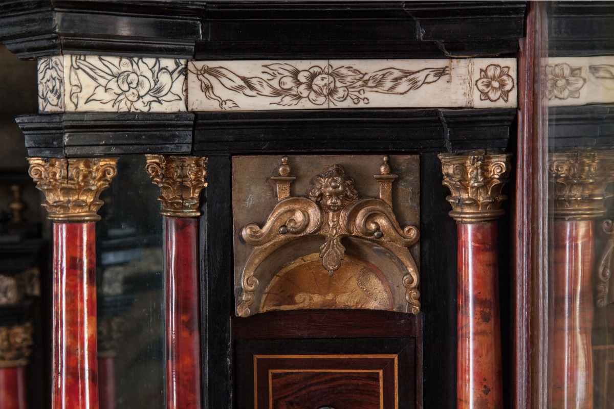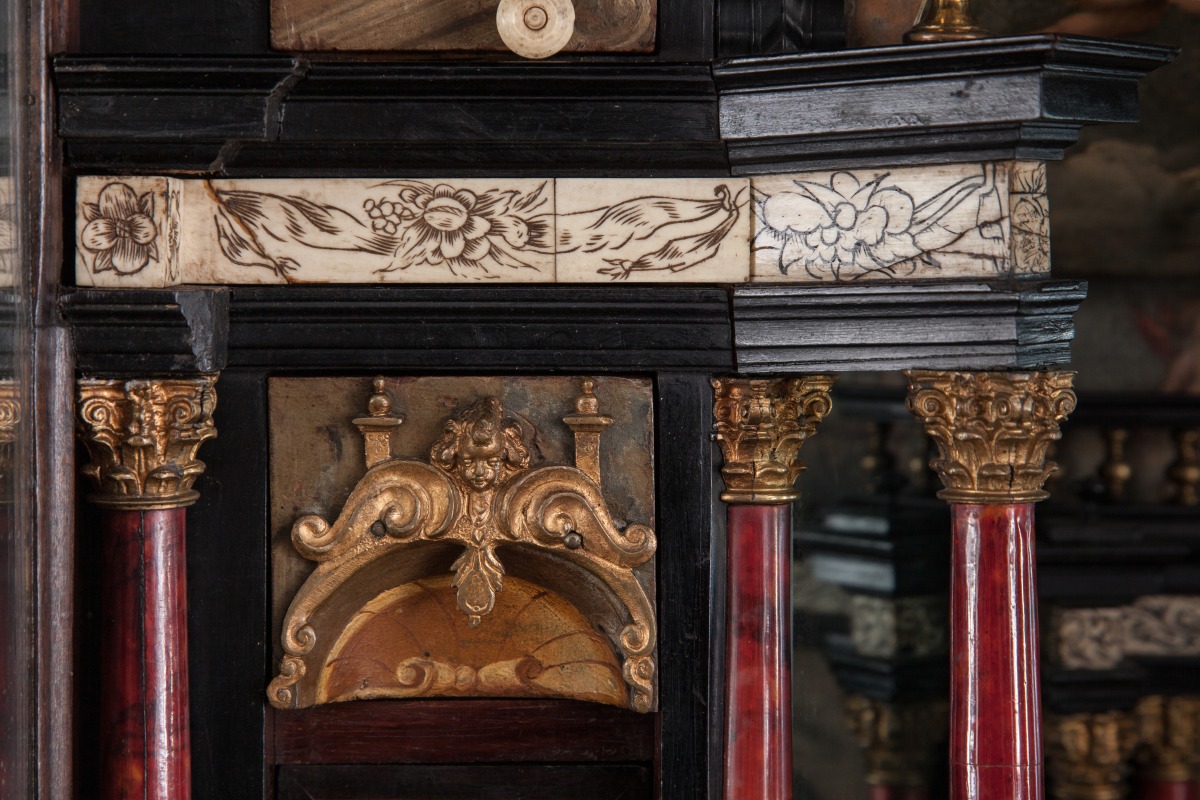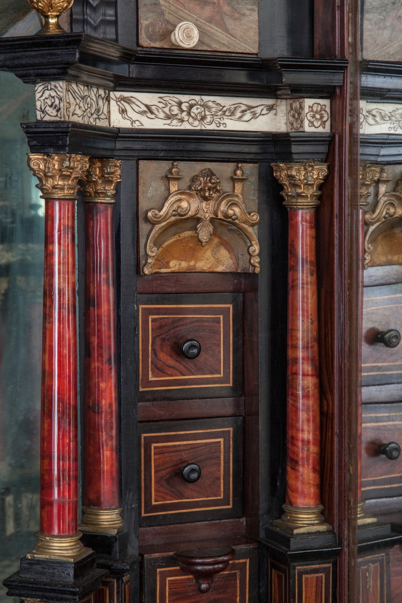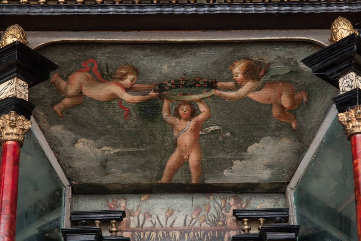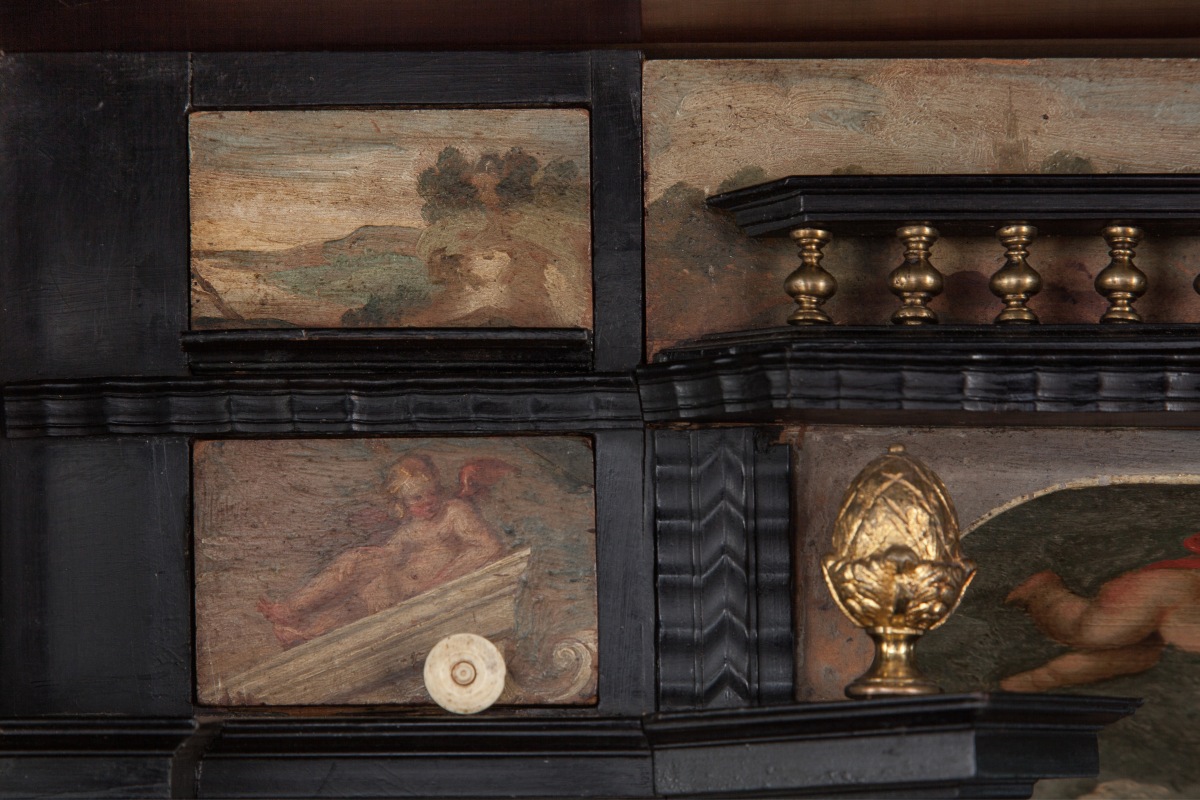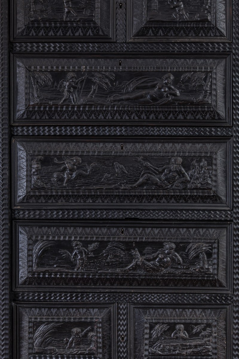 Les six tiroirs flanquant les vantaux présentent des amours et des putti au service de nymphes et des Dieux de l'Olympe : Vénus, Neptune, Cérès et Bacchus. Les six tiroirs des rangées du haut et du bas présentent deux registres dans lesquels s'amusent des enfants avec des instruments de musique, chassant à l'arbalète, faisant tourner un moulin à vent, domptant une chèvre, se baignant, tirant à la fronde ou encore effrayant un animal avec un masque. Les deux tiroirs de la corniche sont ornés d'une frise d'enfants jouant et gardant des chèvres.