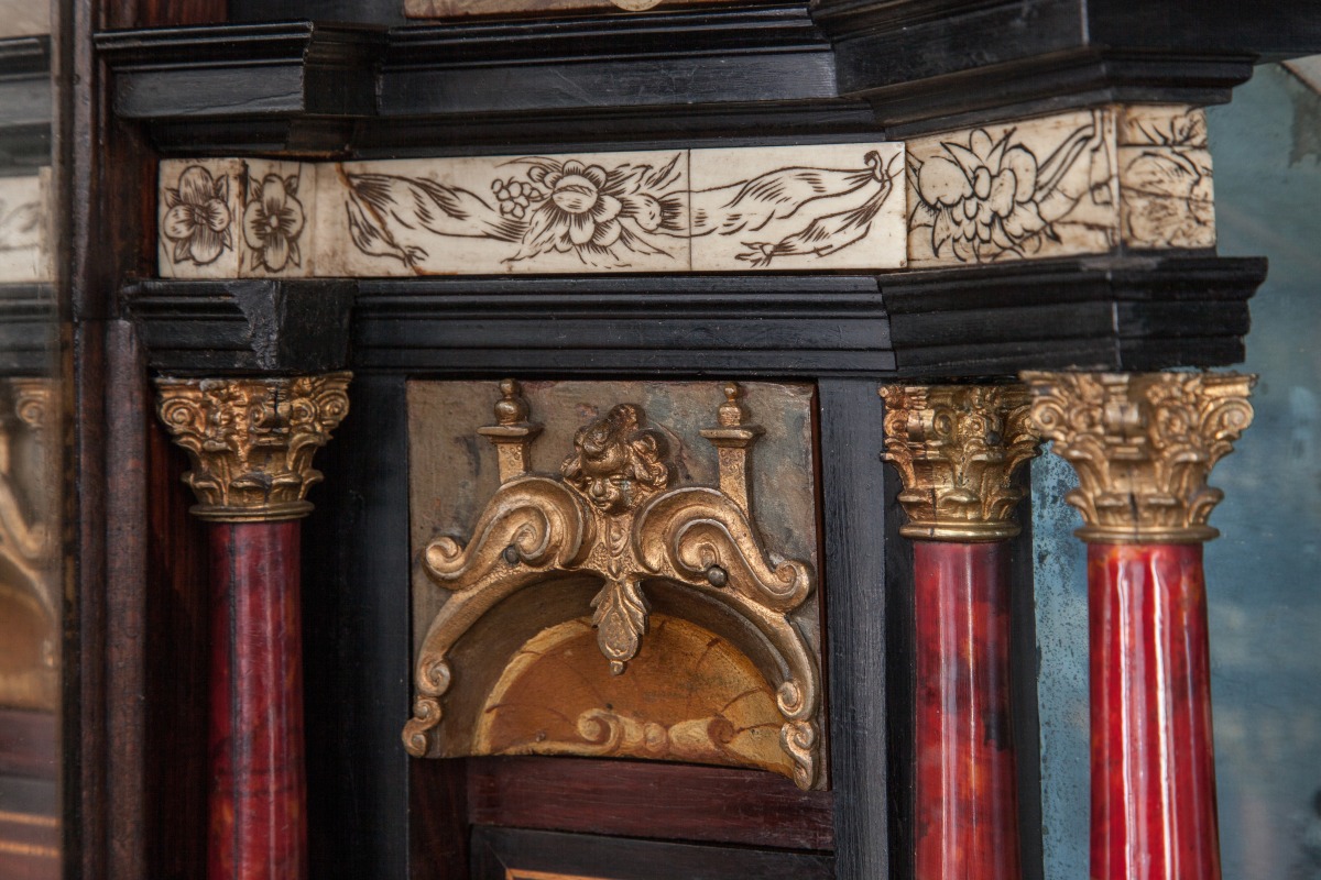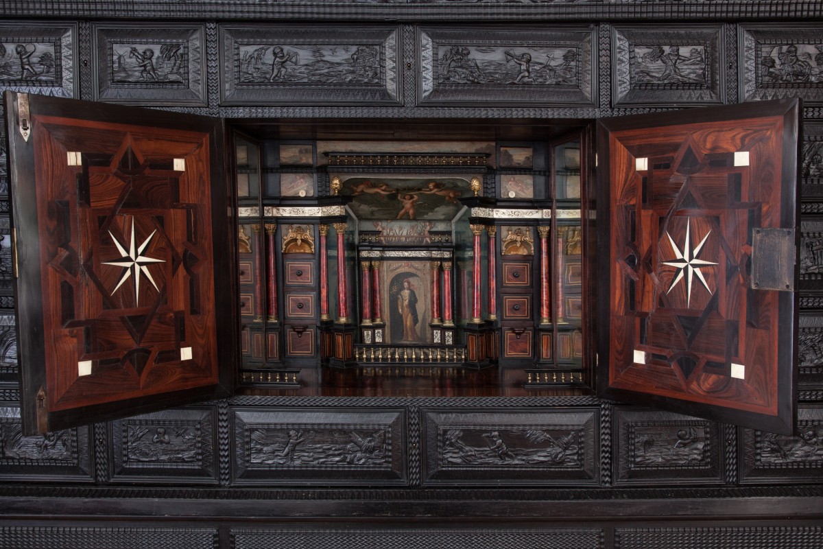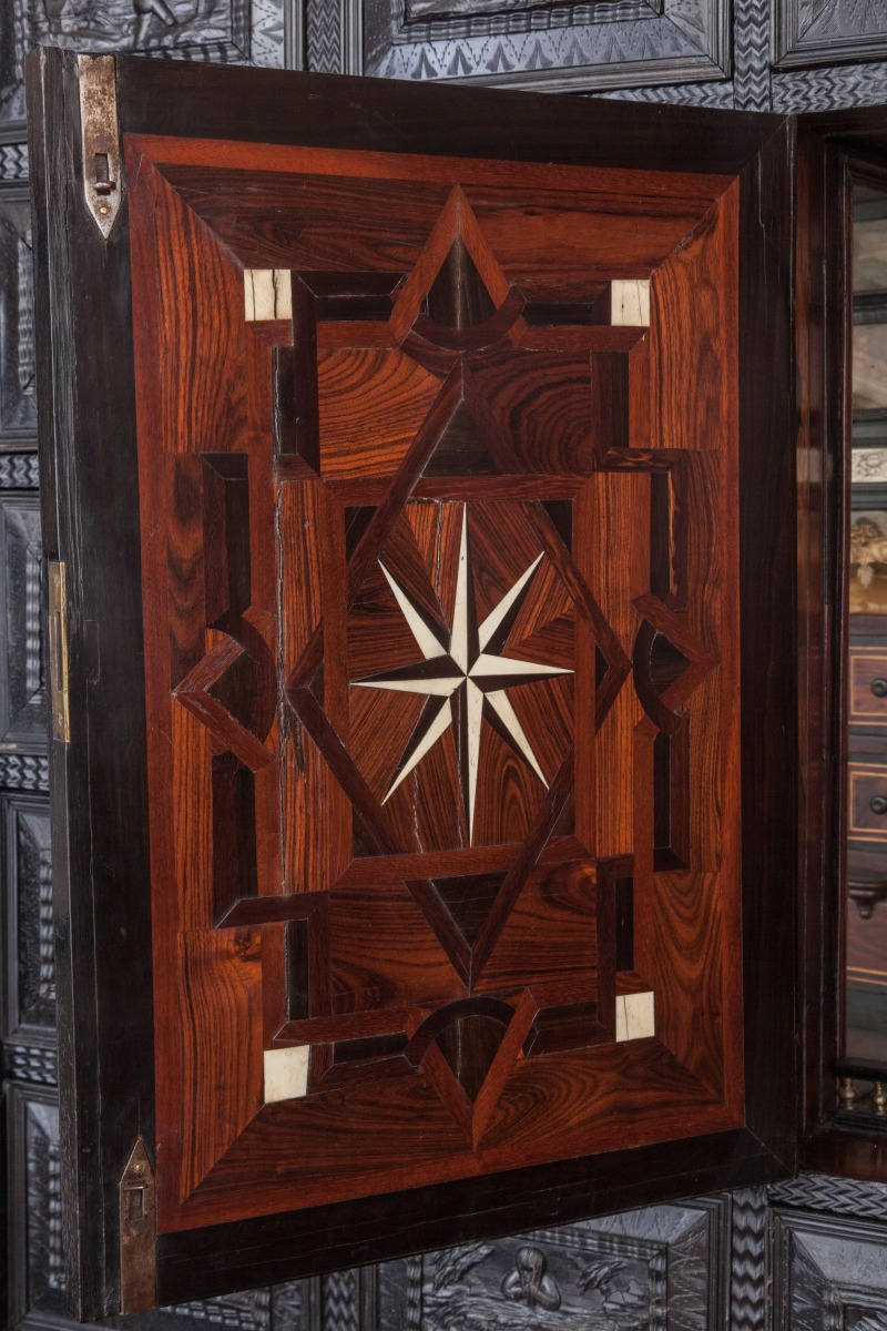 Les deux vantaux sont sculptés d'enfant gardant des chèvres, d'après une œuvre de François DUQUESNOY. Le revers des vantaux à décor en marqueterie de bois précieux et d'ivoire d'une rose des vents dans un encadrement géométrisant.