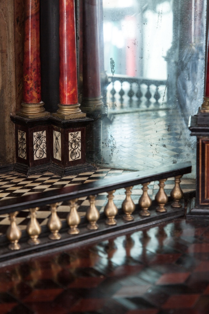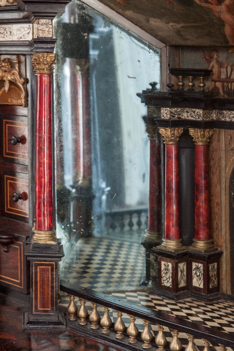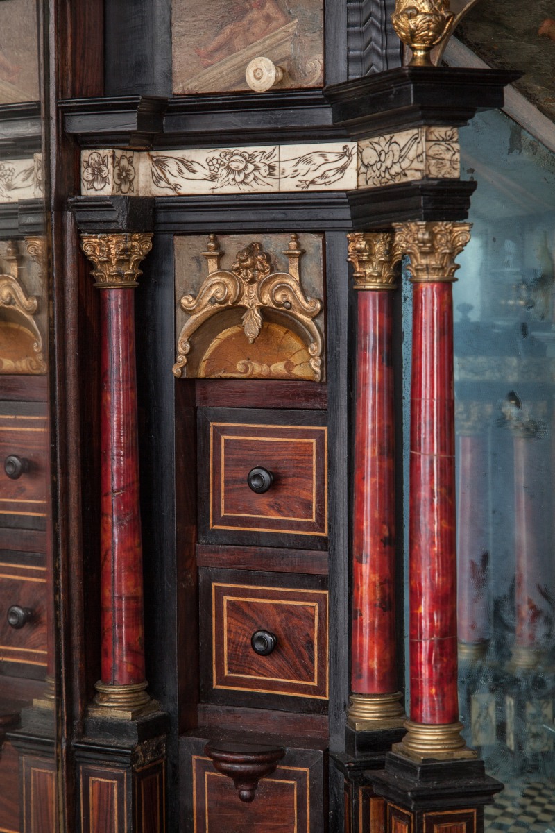 Le théâtre intègre 13 tiroirs, tantôt peints, tantôt marquetés de bois précieux, dans une architecture ornée d'ivoire gravé et de balustrades. 10 colonnes (dont deux en demi) plaquées d'écaille rouge, les chapiteaux et bases en bronze doré, se reflètent dans un jeu de miroirs. La partie centrale du caisson, marquetée d'un damier et de cubes, simule une perspective de palais accentuée par deux miroirs. Elle est agrémentée de trois panneaux peints. Celui du fond figurant l'allégorie de l'Abondance est sommée de deux Amours portant des tulipes. Le plafond de forme trapézoïdale reçoit trois putti élevant une couronne de fleurs.