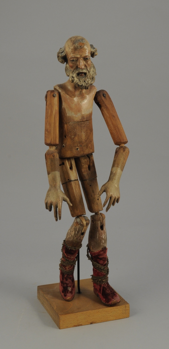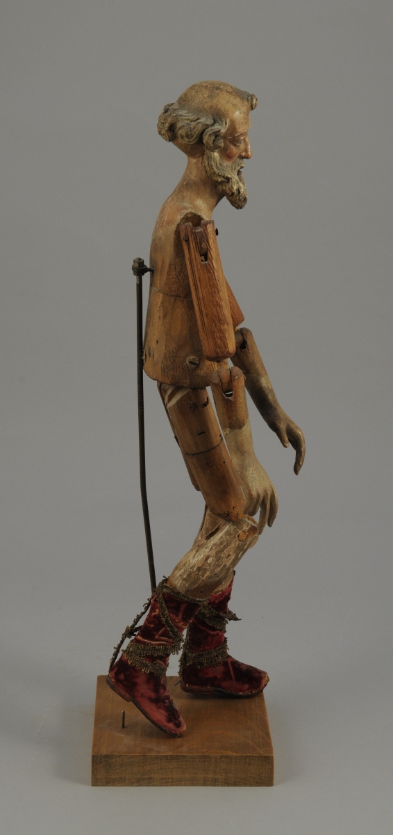 SANTON de CRÈCHE NAPOLITAINE articulé figurant un vieil homme barbu en bois sculpté et peint. Bottes en velours cramoisi et galons or (usures).