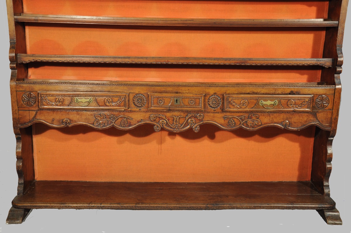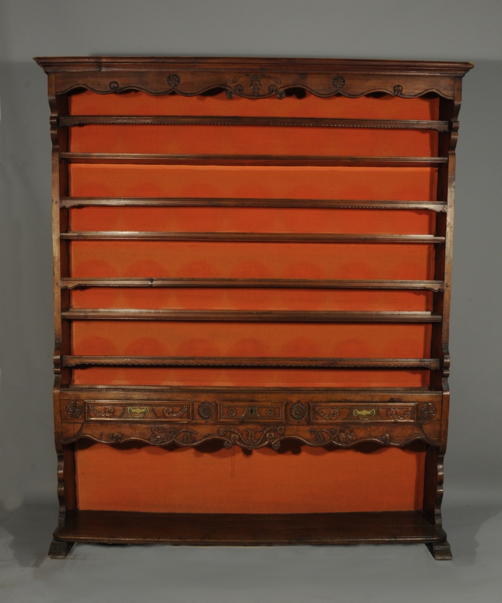 VAISSELIER à cinq niveaux en noyer mouluré et sculpté. Il ouvre en façade par trois tiroirs. La traverse supérieure chantournée ornée de volutes feuillagées, fleurons et centrée d'un vase fleuri. La traverse qui reçoit les tiroirs est-elle sculptée de pampres de vignes et de rosaces. Poignées de tirages et entrées de serrure en laiton. Repose sur deux pieds patins.