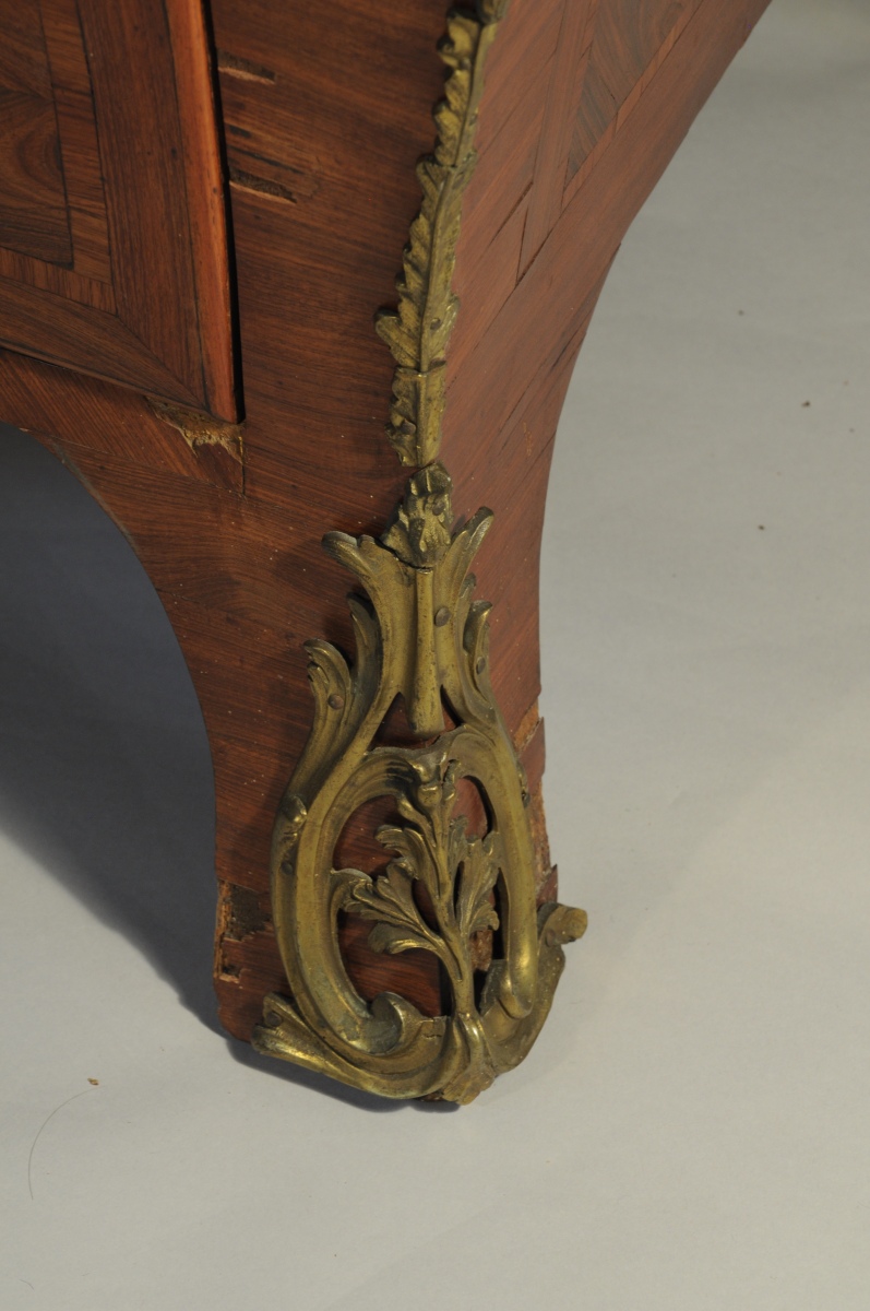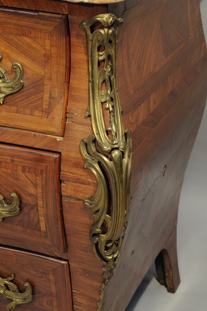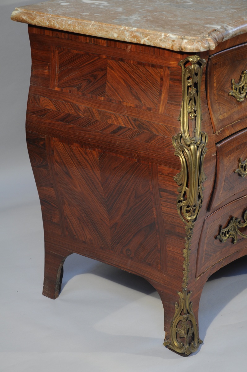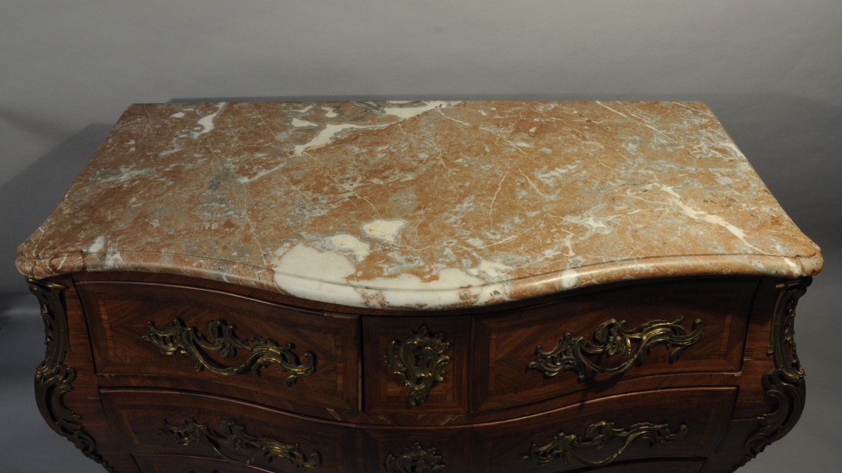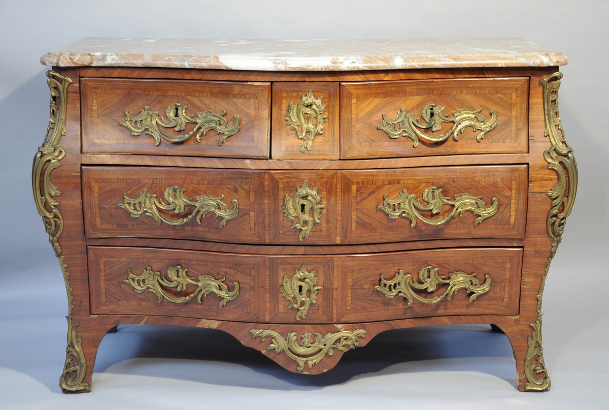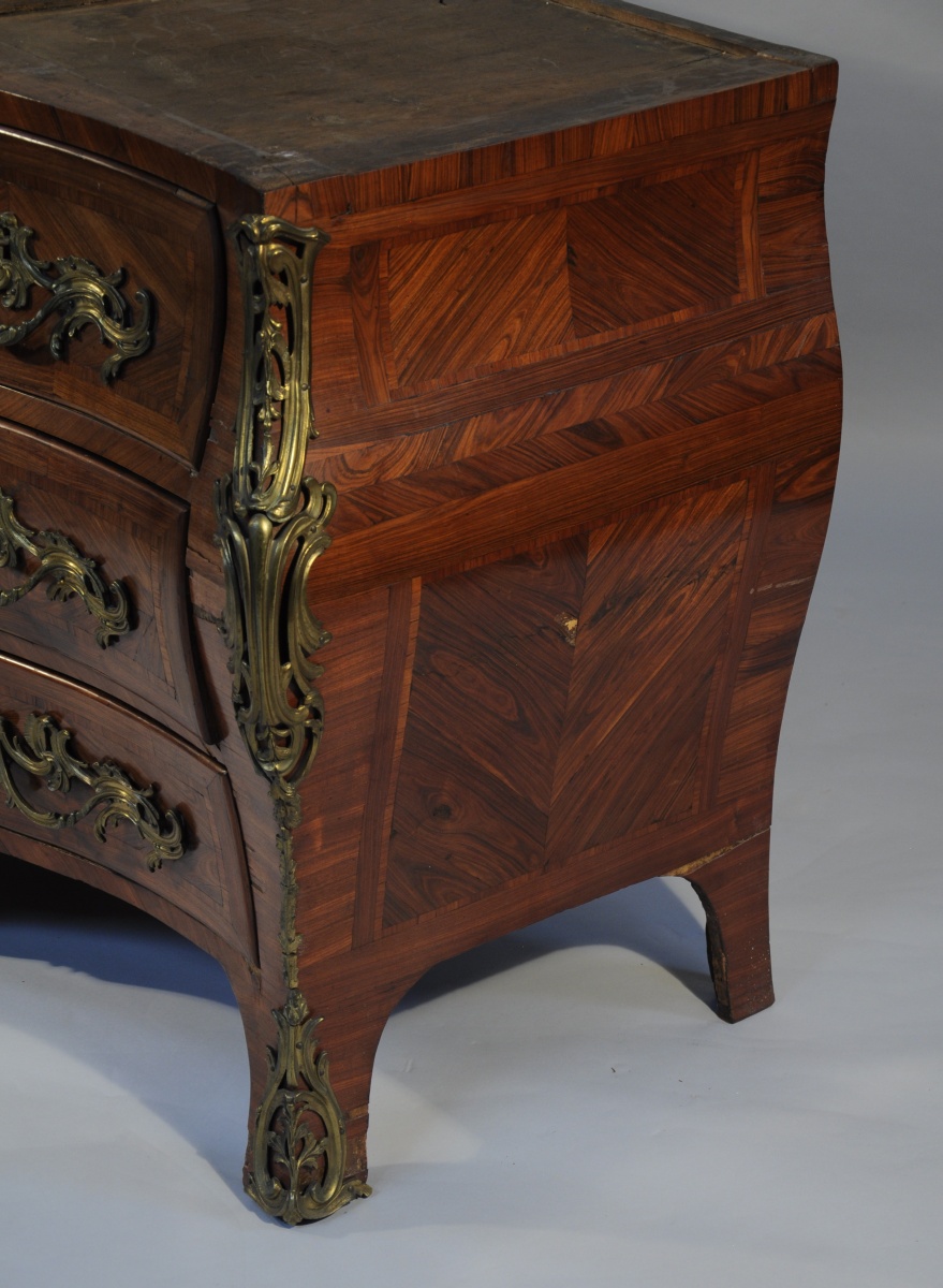 COMMODE TOMBEAU en placage de bois de rose disposé en feuilles ouvrant en façade par cinq tiroirs sur trois rangs, dont un en faux dormant. Montants antérieurs pincés terminés par des pieds courbés. Montants et pieds postérieurs courbés. Ornementation de bronzes ciselés et dorés ajourés tels que poignées de tirage, entrées de serrure, chutes, sabots et tablier. Dessus de marbre rouge de Belgique.