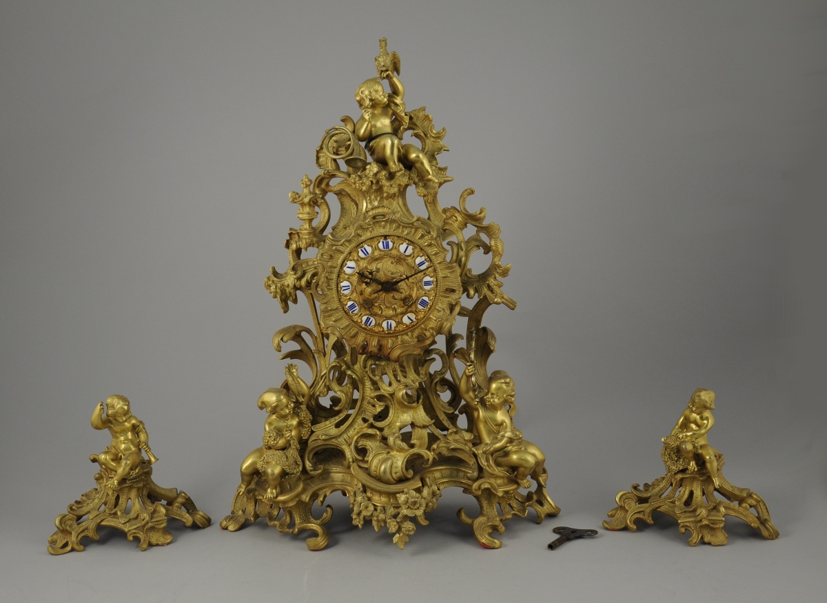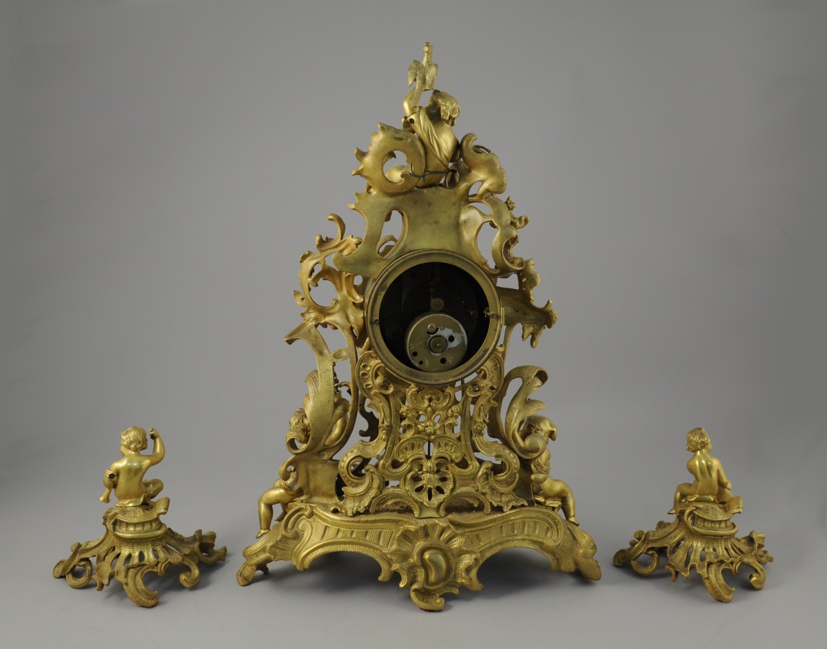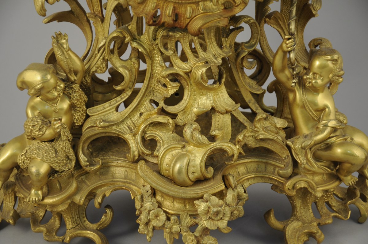 GARNITURE DE CHEMINÉE aux PUTTI CHASSEURS et PÊCHEURS en bronze doré à riche décor asymétrique ajouré d'acanthes stylisées, fleurs, agrafes et volutes.