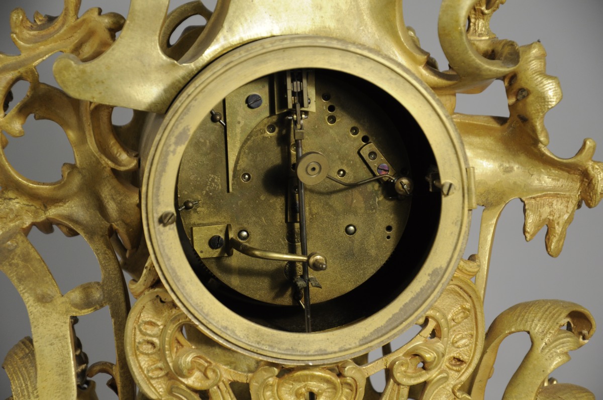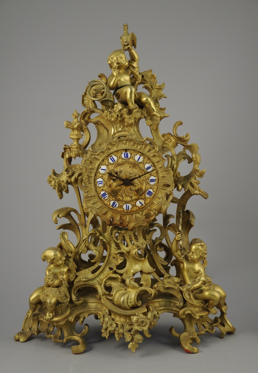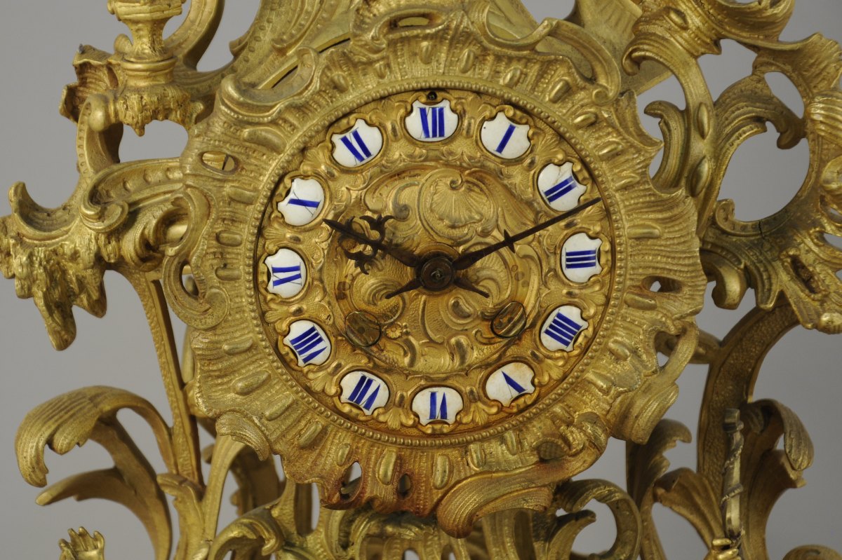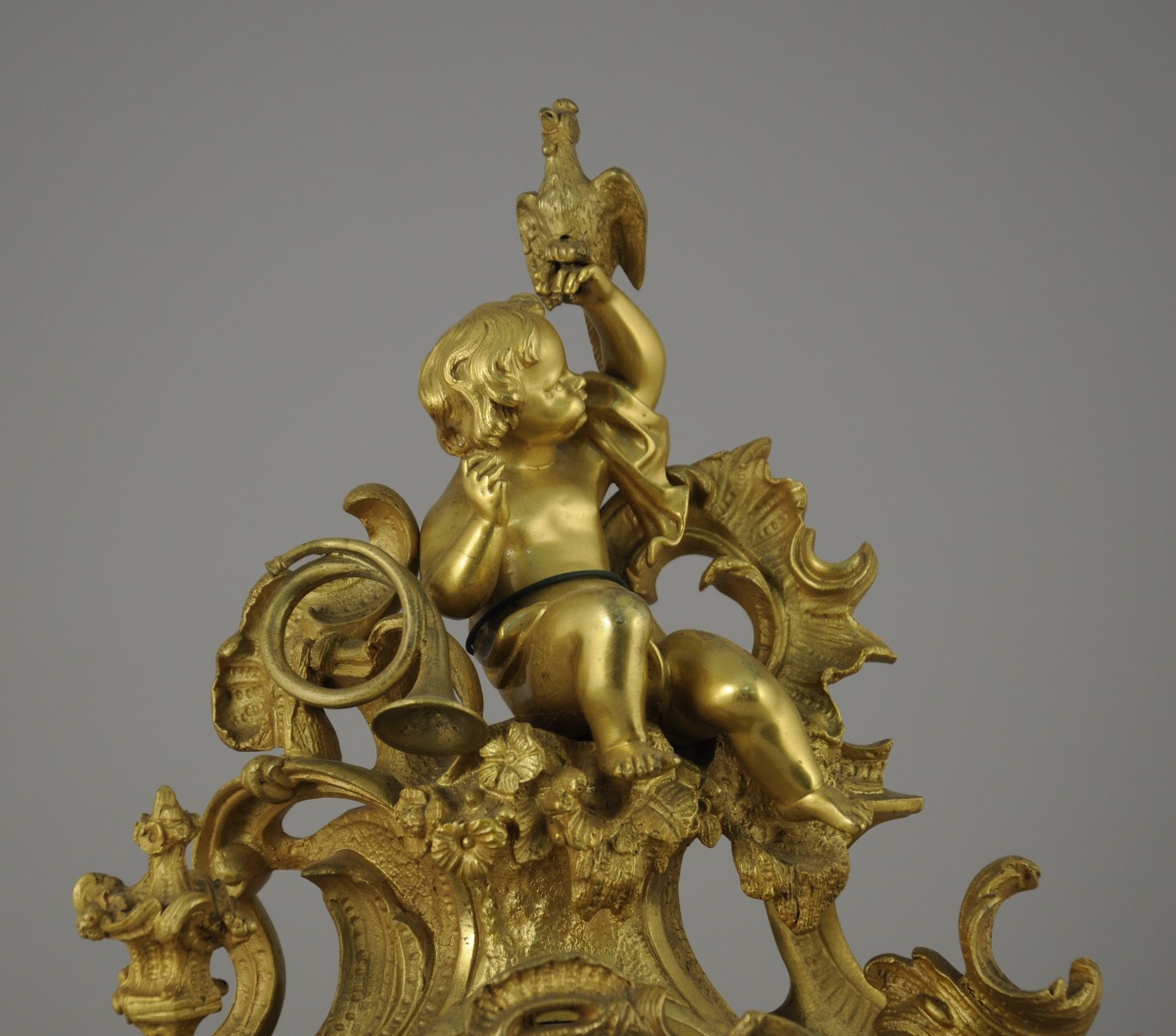 GARNITURE DE CHEMINÉE aux PUTTI CHASSEURS et PÊCHEURS en bronze doré à riche décor asymétrique ajouré d'acanthes stylisées, fleurs, agrafes et volutes.