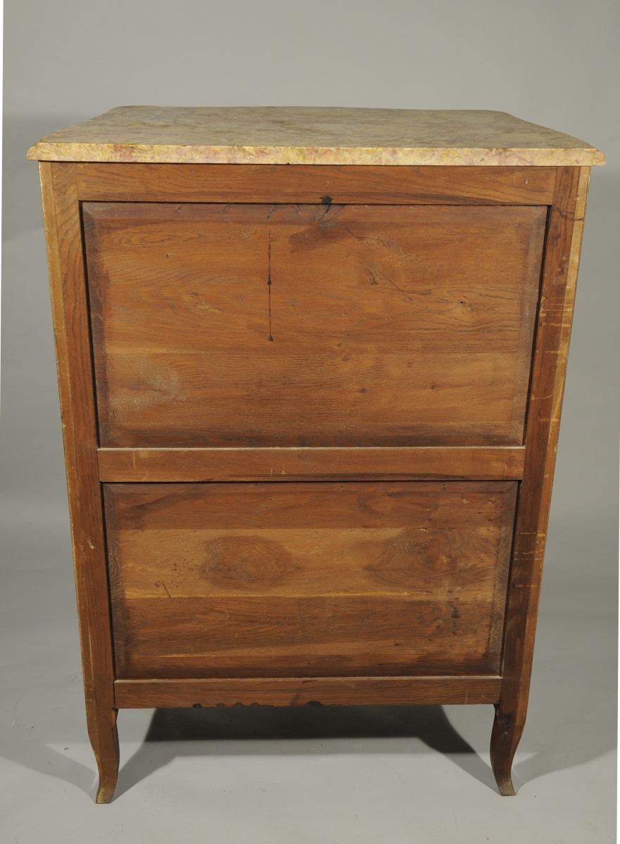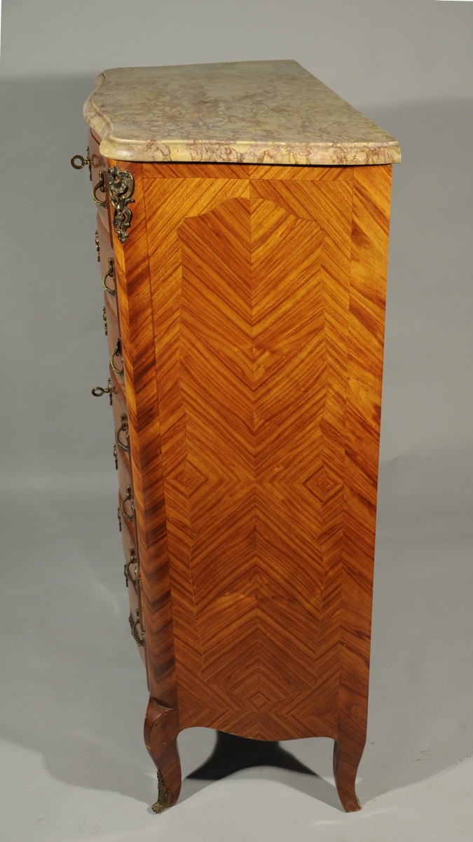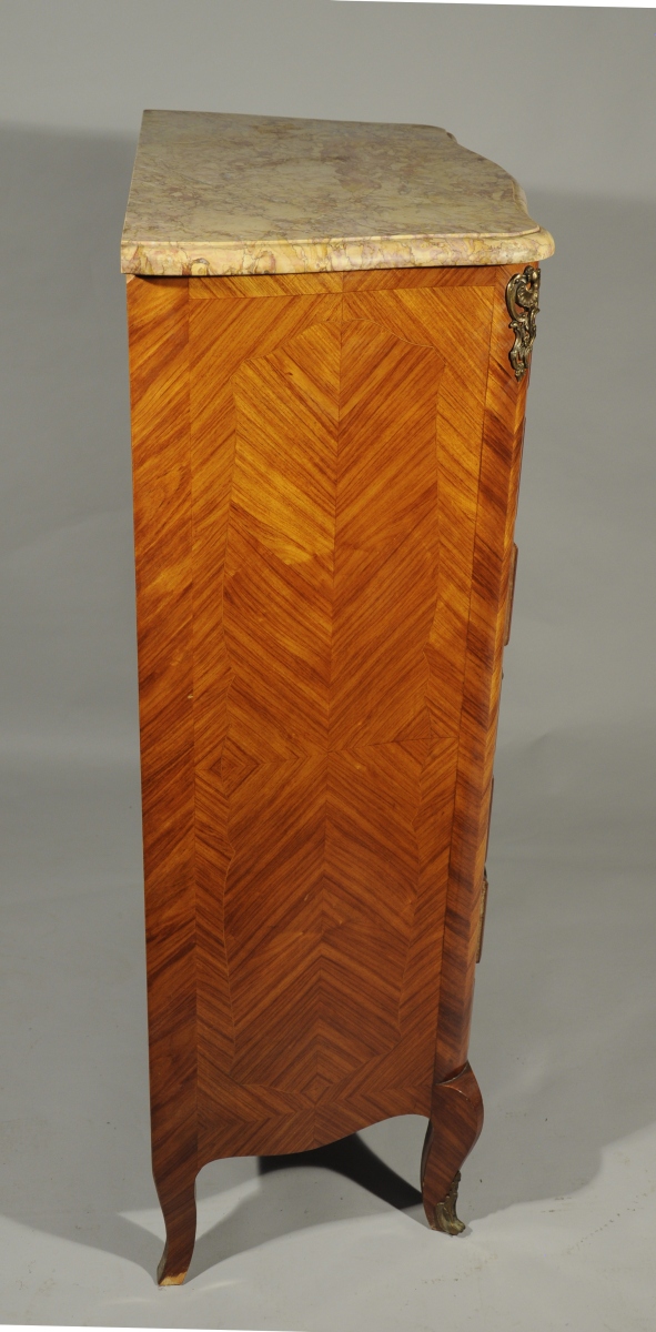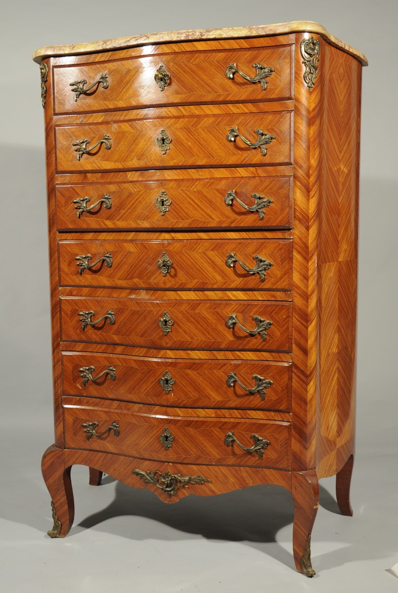 SEMAINIER à façade mouvementée en placage de bois de rose reposant sur quatre pieds cambrés. Garniture de bronzes feuillagés telle que poignées de tirage, entrées de serrure, chutes et sabots. Dessus de marbre brocatelle.