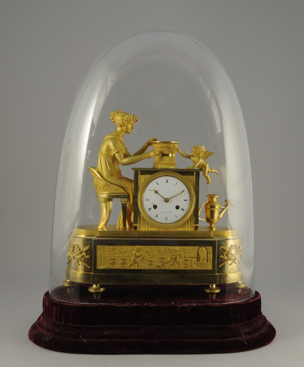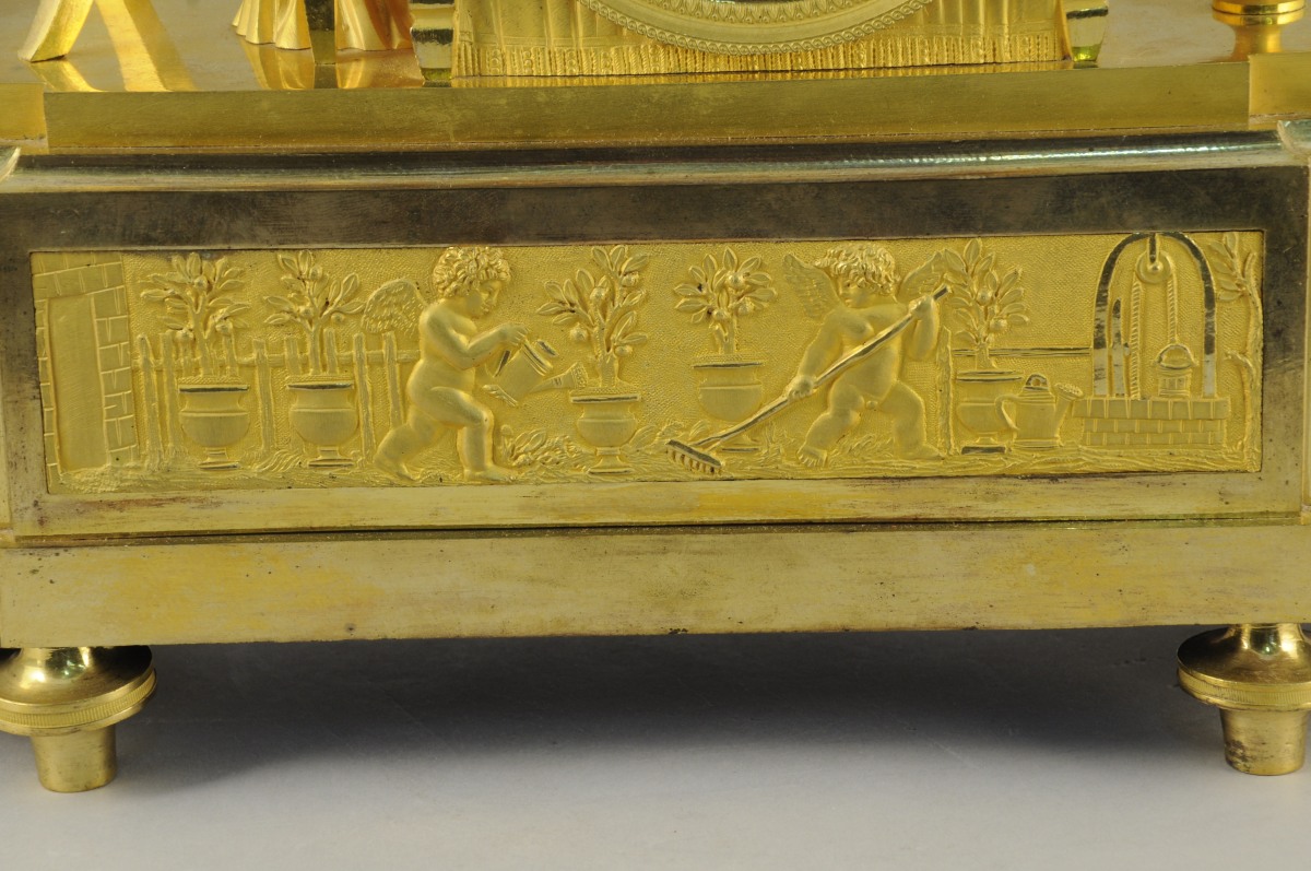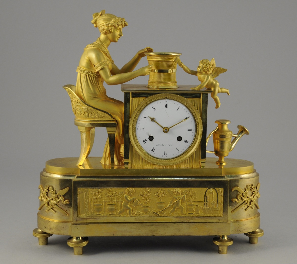 Pendule à sujet en bronze ciselé et doré, bruni et amati. Elle figure une femme drapée à l'Antique assise à une table drapée à pieds gaine enserrant le cadran. Elle se tient dans un fauteuil à dossier enveloppant face à un pot strié. Elle tend le bras vers un amour qui lui offre une aile de papillon. À droite est posé un arrosoir. Base ovale à ressaut central orné d'un bas-relief figurant des amours jardiniers flanqué de trophées horticoles. Elle repose sur six pieds toupie. Cadran émaillé blanc indiquant les heures en chiffres romains et les quarts d'heure en chiffres arabes inscrit dans une borne et signé Millet à Tours. Mécanisme à fil.