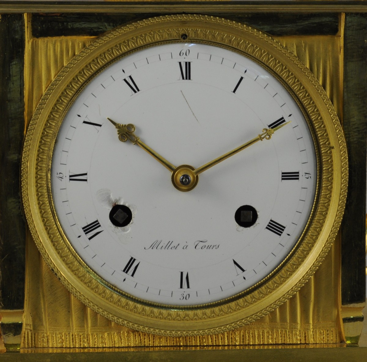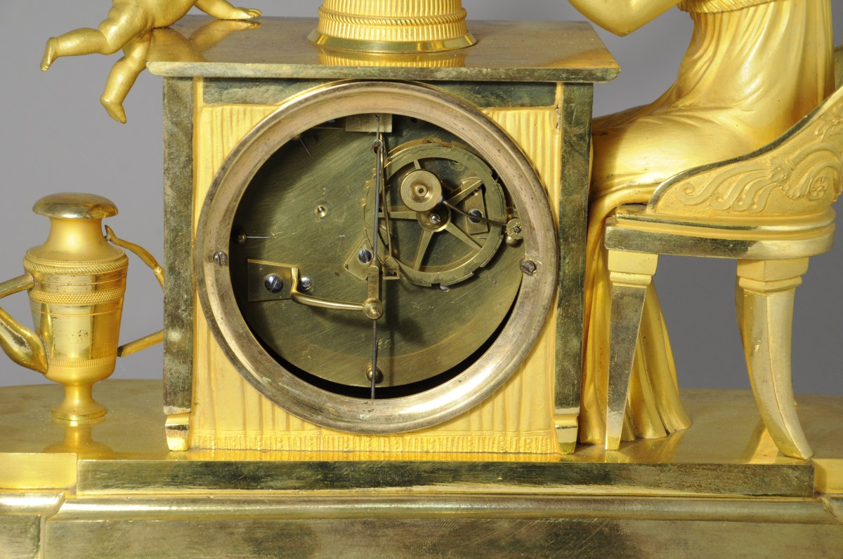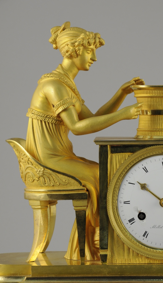 Pendule à sujet en bronze ciselé et doré, bruni et amati. Elle figure une femme drapée à l'Antique assise à une table drapée à pieds gaine enserrant le cadran. Elle se tient dans un fauteuil à dossier enveloppant face à un pot strié. Elle tend le bras vers un amour qui lui offre une aile de papillon. À droite est posé un arrosoir. Base ovale à ressaut central orné d'un bas-relief figurant des amours jardiniers flanqué de trophées horticoles. Elle repose sur six pieds toupie. Cadran émaillé blanc indiquant les heures en chiffres romains et les quarts d'heure en chiffres arabes inscrit dans une borne et signé Millet à Tours. Mécanisme à fil.