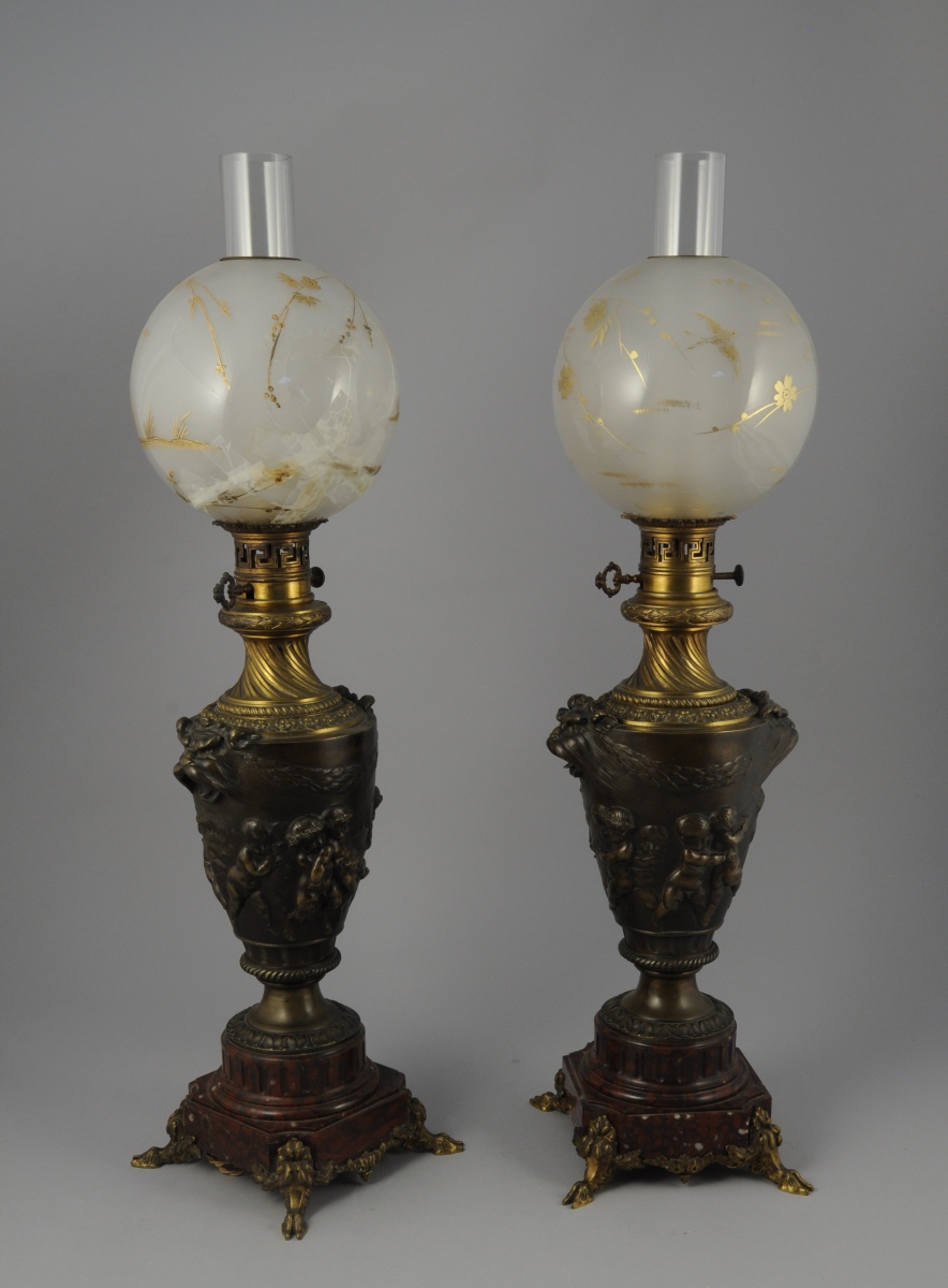 PAIRE DE LAMPES À PÉTROLE de forme balustre en bronze doré et patiné. Le corps à décor circulaire d'une procession bachique de putti et satyres. Les anses adoptent la forme d'une tête d'animal fabuleux. Piédouche à frise de corde et de rais de coeurs.