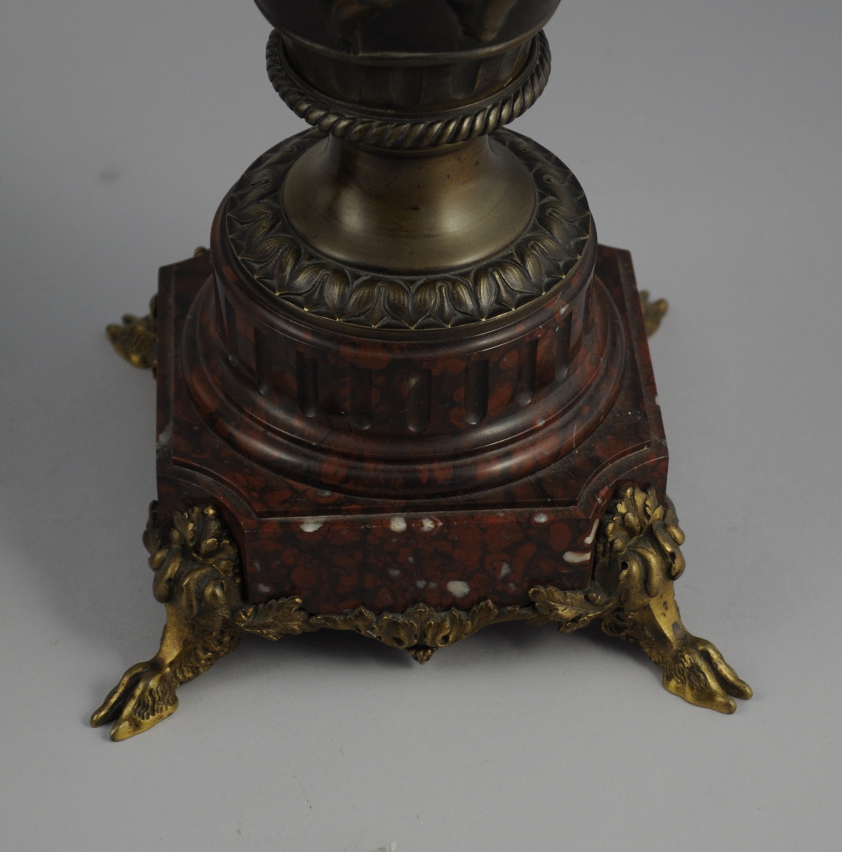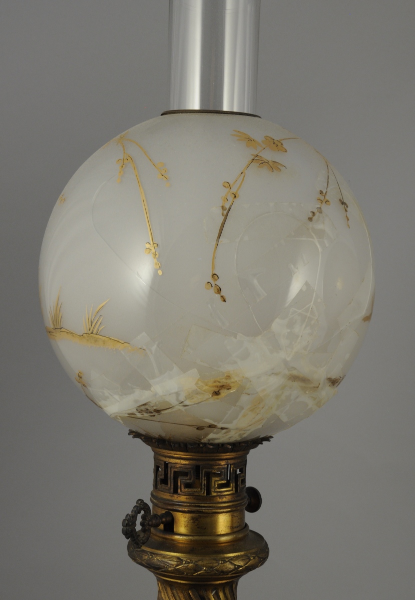 Socle en marbre griotte à quatre pieds sabots et frises feuillagées. Cheminées et globes en verre sablé et peint à l'or (l'un accidenté).