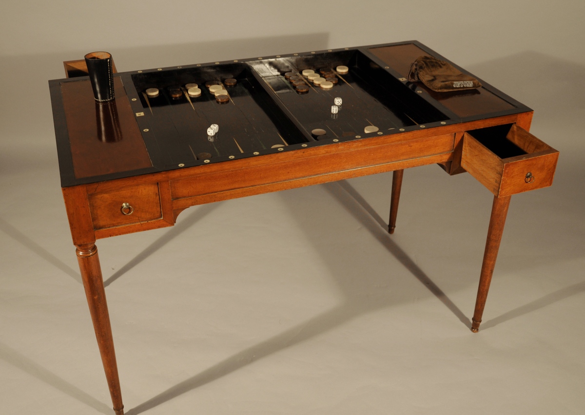 TABLE TRIC-TRAC formant bureau, en acajou et placage. Le plateau amovible foncé d'un maroquin découvrant un intérieur plaqué d'ébène, ivoire et os teinté vert. Il repose sur quatre pieds fuselés.