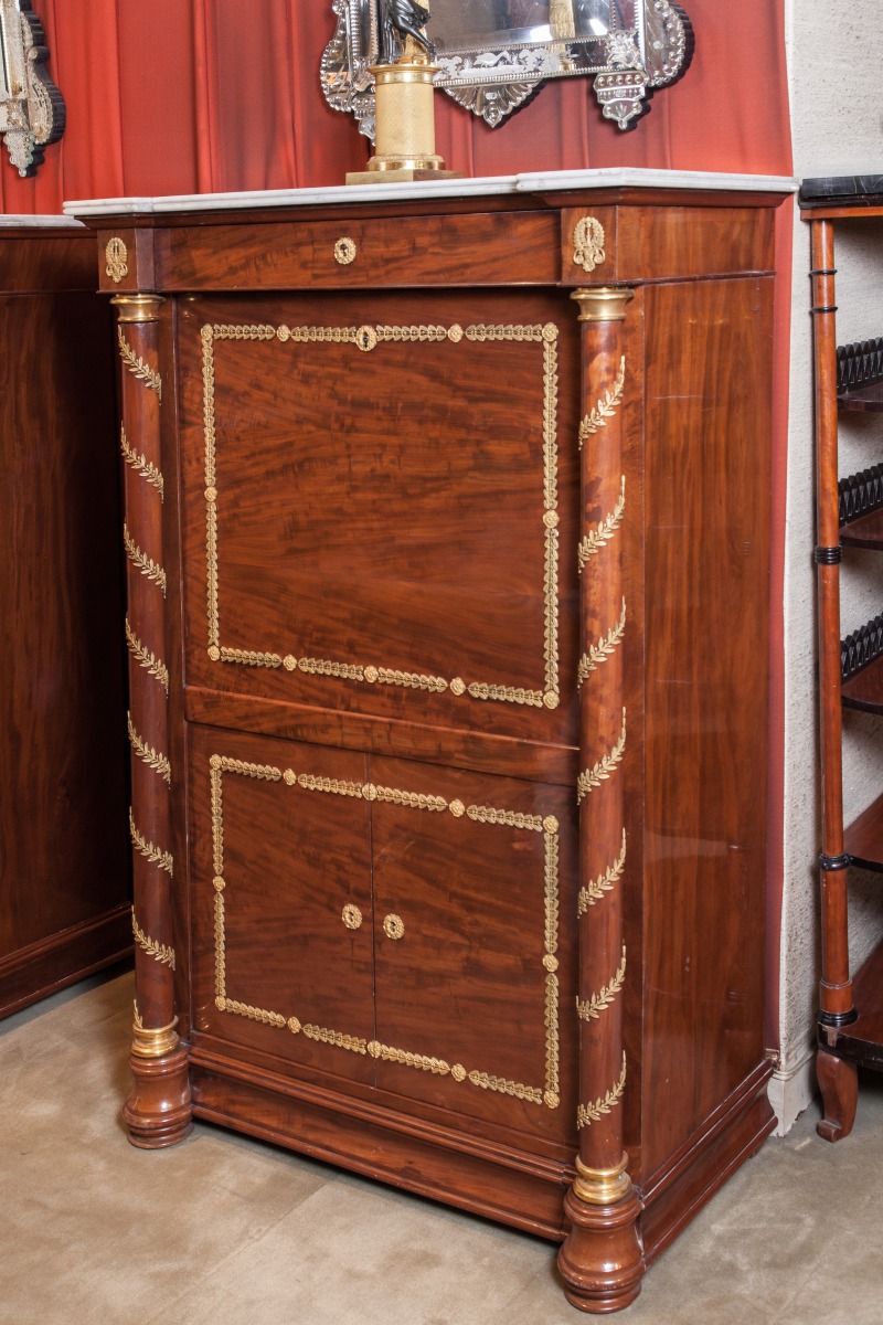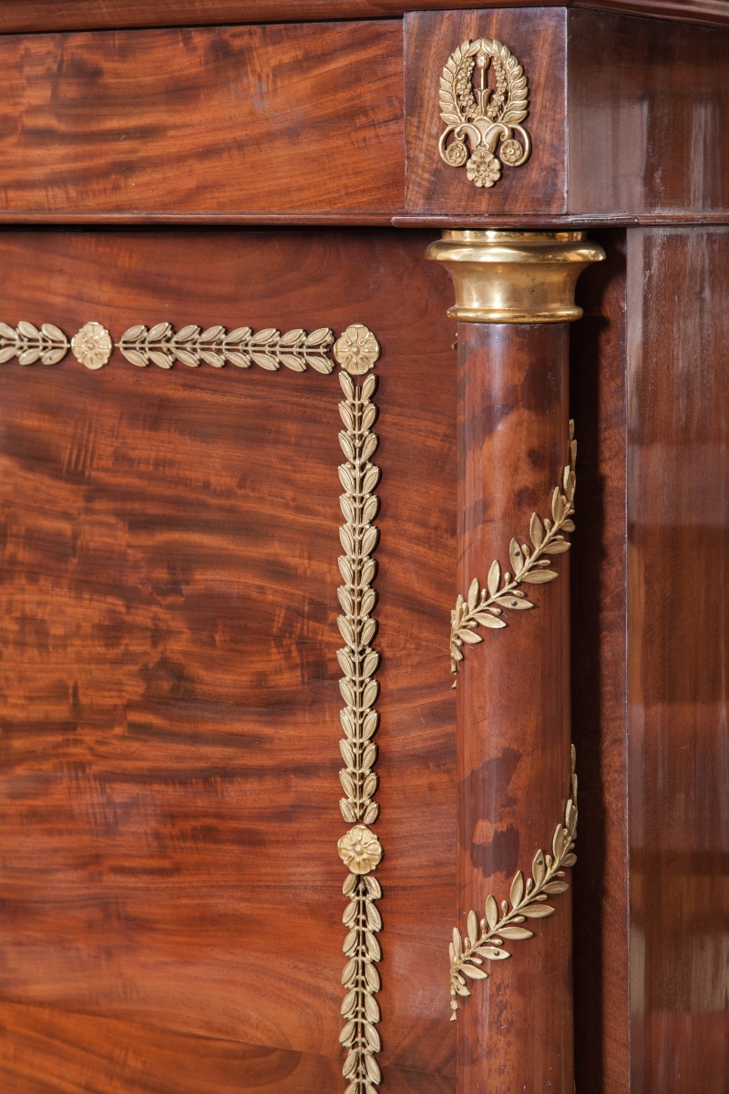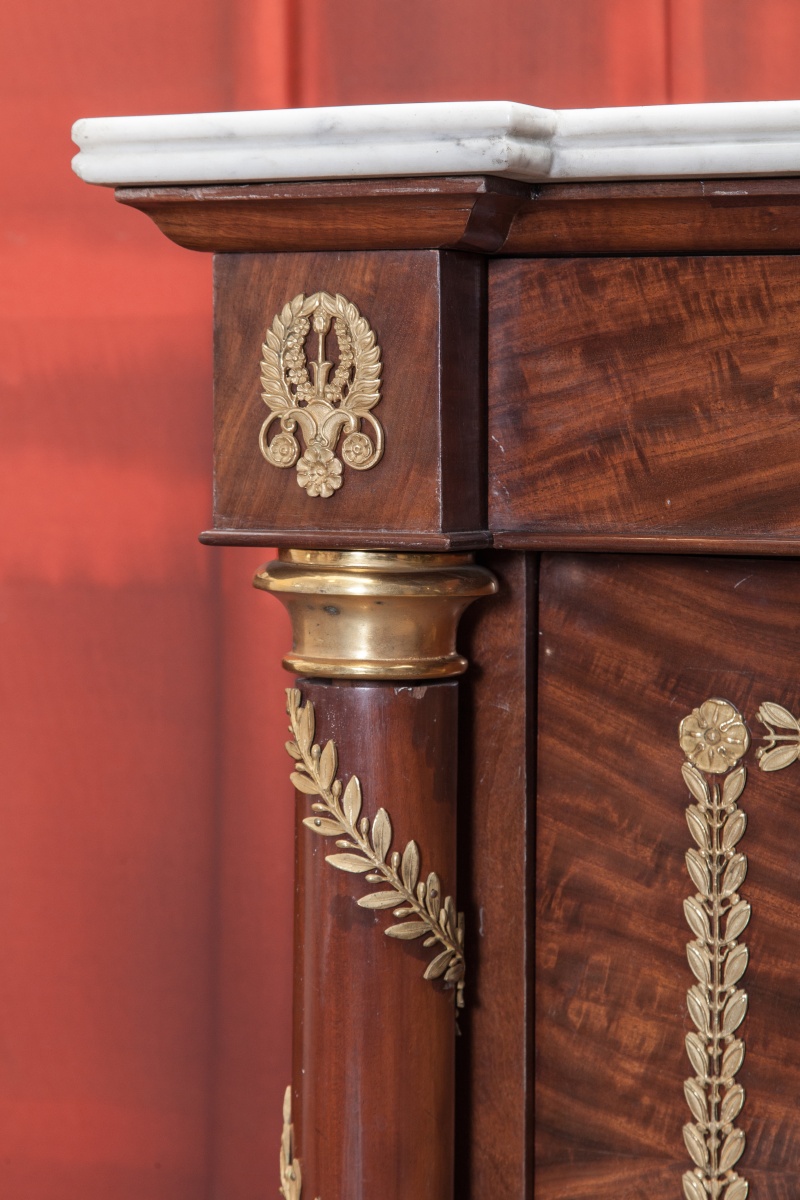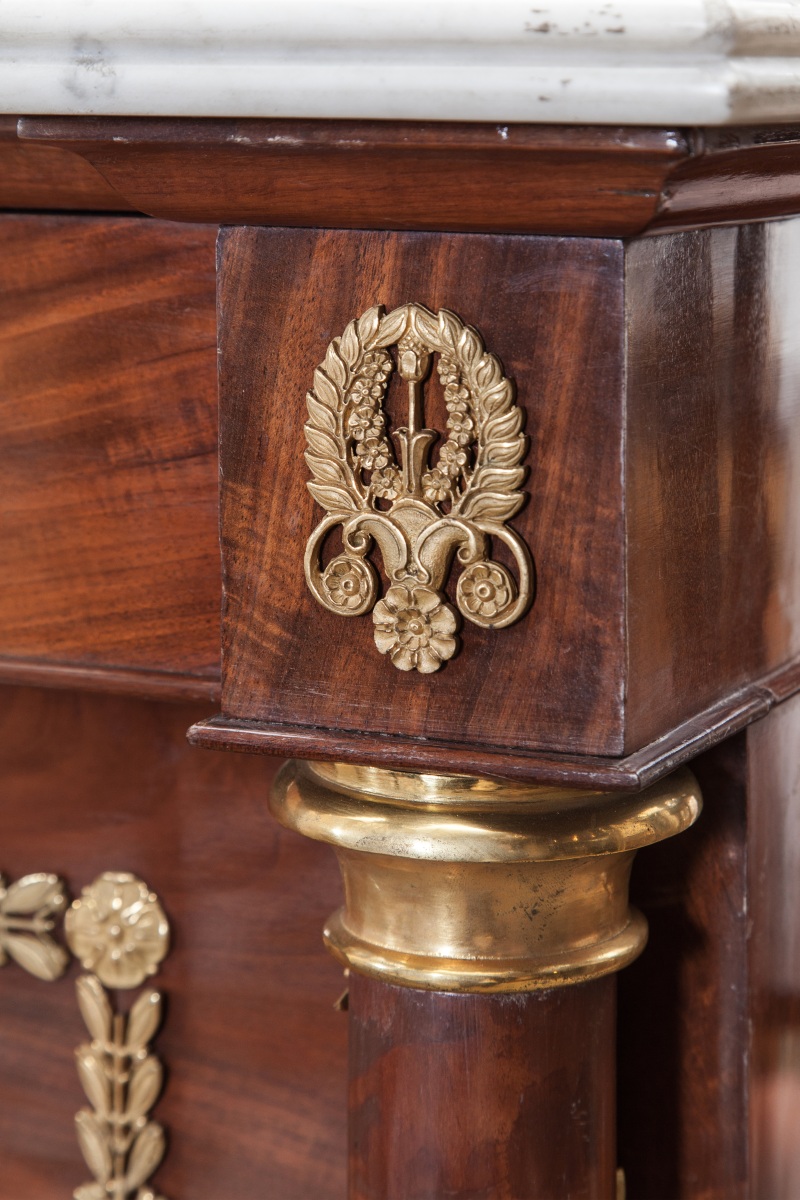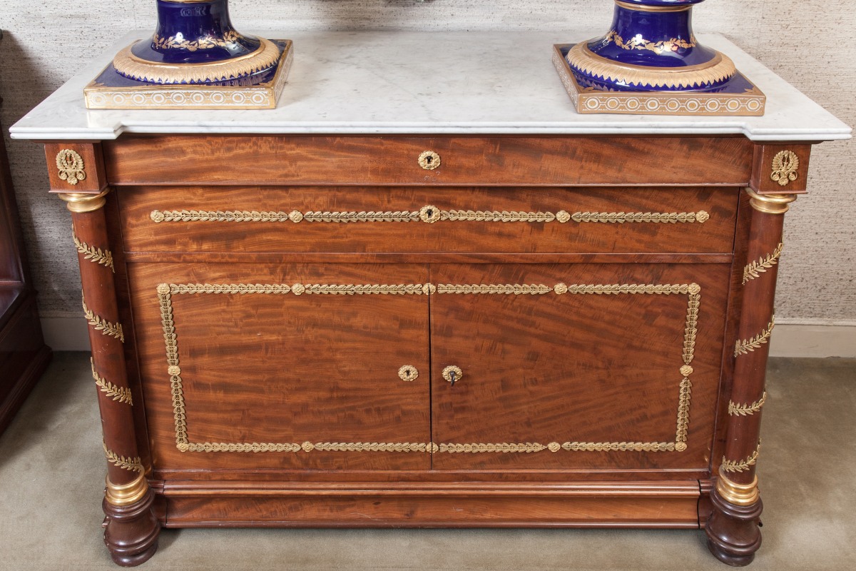 Important MOBILIER DE CHAMBRE À COUCHER en acajou et placage d'acajou flammé. Montants en colonnes détachées. Riche ornementation de bronzes dorés : fleurons, feuillages et torsades feuillagées. Dessus de marbre blanc à double boudin.