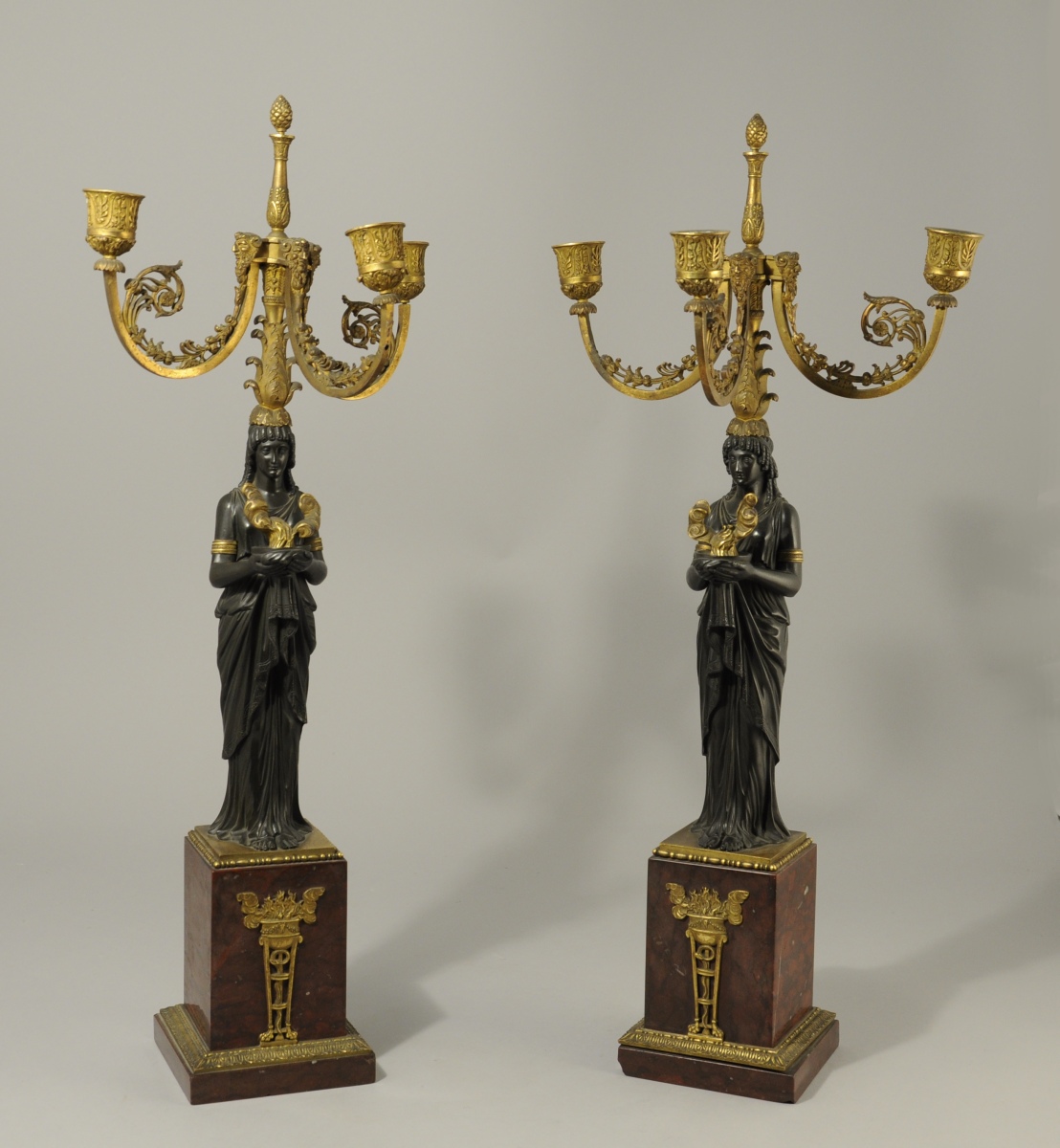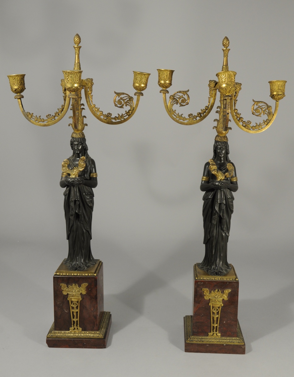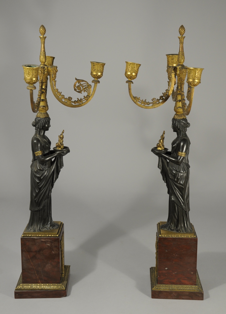 PAIRE DE CANDÉLABRES à trois lumières en bronze ciselé, doré ou patiné. Les fûts figurent une vestale vêtue d'un drapé et tenant une vasque d'où s'échappent les flammes du feu sacré. Elles supportent les bras de lumières sur leur tête. Ces derniers à décor ajouré de rinceaux feuillagés, palmettes, feuilles d'acanthe stylisées et masques de faunes. Une tige de préhension en balustre sommée d'une pomme de pin à l'amortissement. Socle de forme rectangulaire en marbre griotte orné d'une athénienne embrasée et d'une frise de palmettes.