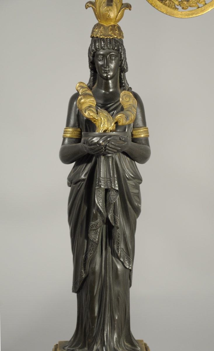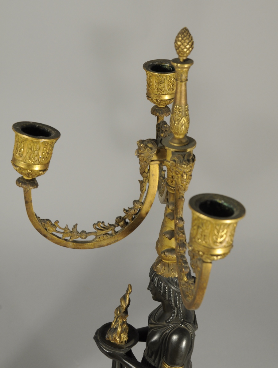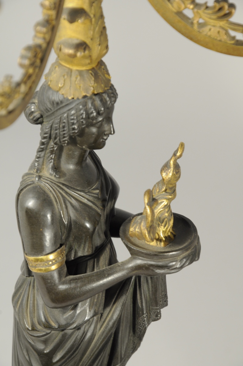 PAIRE DE CANDÉLABRES à trois lumières en bronze ciselé, doré ou patiné. Les fûts figurent une vestale vêtue d'un drapé et tenant une vasque d'où s'échappent les flammes du feu sacré. Elles supportent les bras de lumières sur leur tête. Ces derniers à décor ajouré de rinceaux feuillagés, palmettes, feuilles d'acanthe stylisées et masques de faunes. Une tige de préhension en balustre sommée d'une pomme de pin à l'amortissement. Socle de forme rectangulaire en marbre griotte orné d'une athénienne embrasée et d'une frise de palmettes.