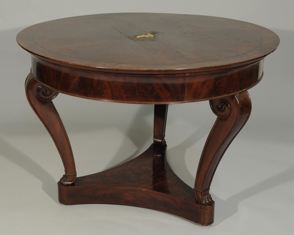 TABLE ronde tripode en placage d'acajou ouvrant par un tiroir en ceinture. Plateau orné au centre de palmettes rayonnantes et de filets de bois noirci. Pieds en jarrets terminés par des pattes de lion et réunis par une tablette d'entrejambe montée sur roulettes.