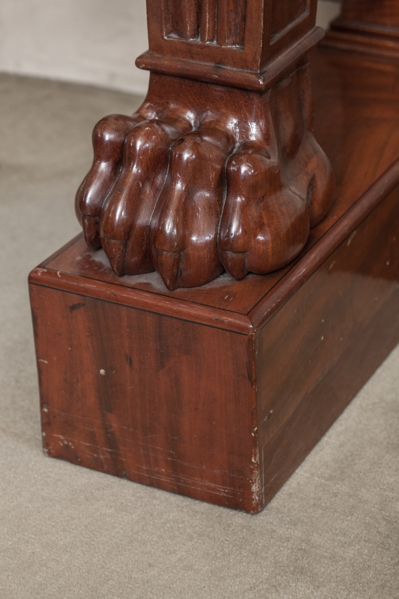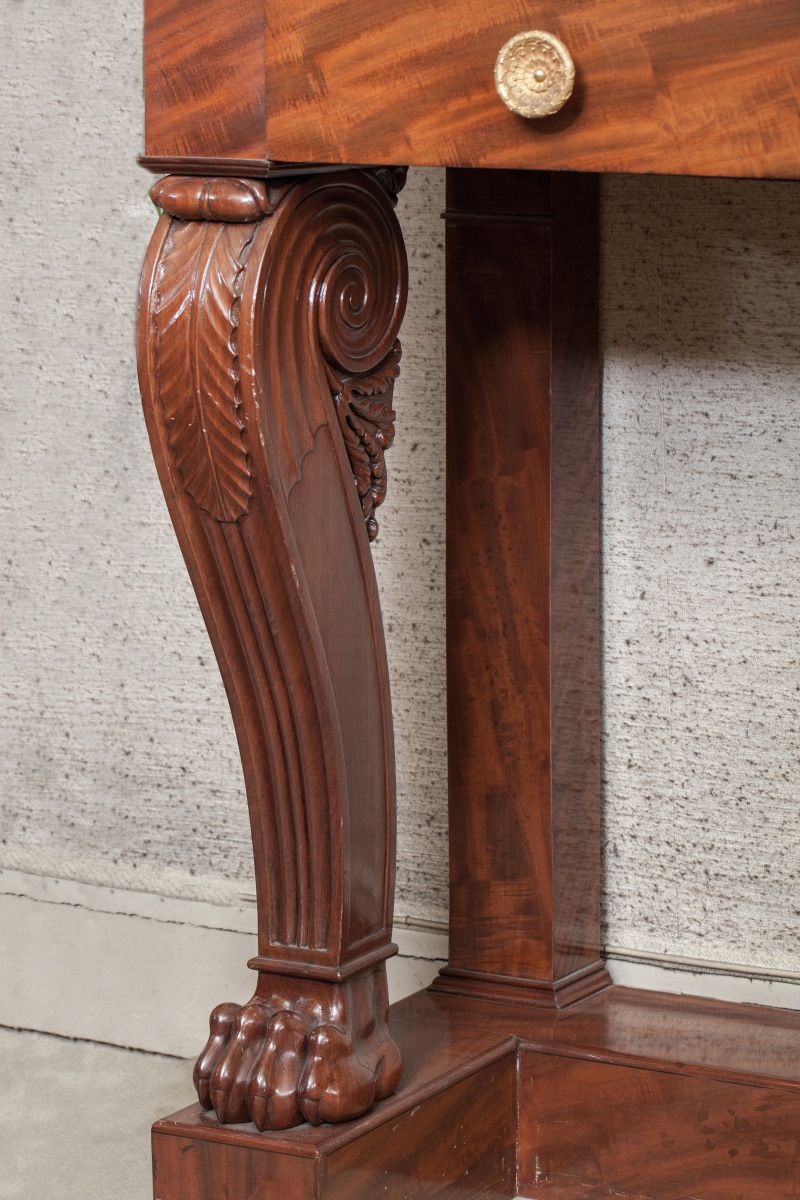 CONSOLE d'APPLIQUE rectangulaire en acajou et placage d'acajou ouvrant à un tiroir. Montants antérieurs en console à volutes, à griffes de lion sculptées de feuilles d'acanthe et laurier. Montants arrière en pilastre. Base socle échancrée. Poignées en bronze doré. Dessus de marbre blanc veiné.