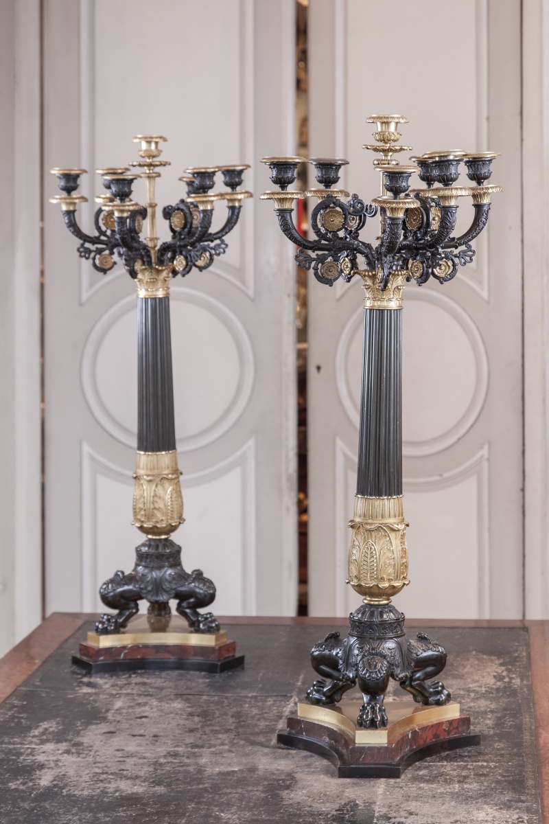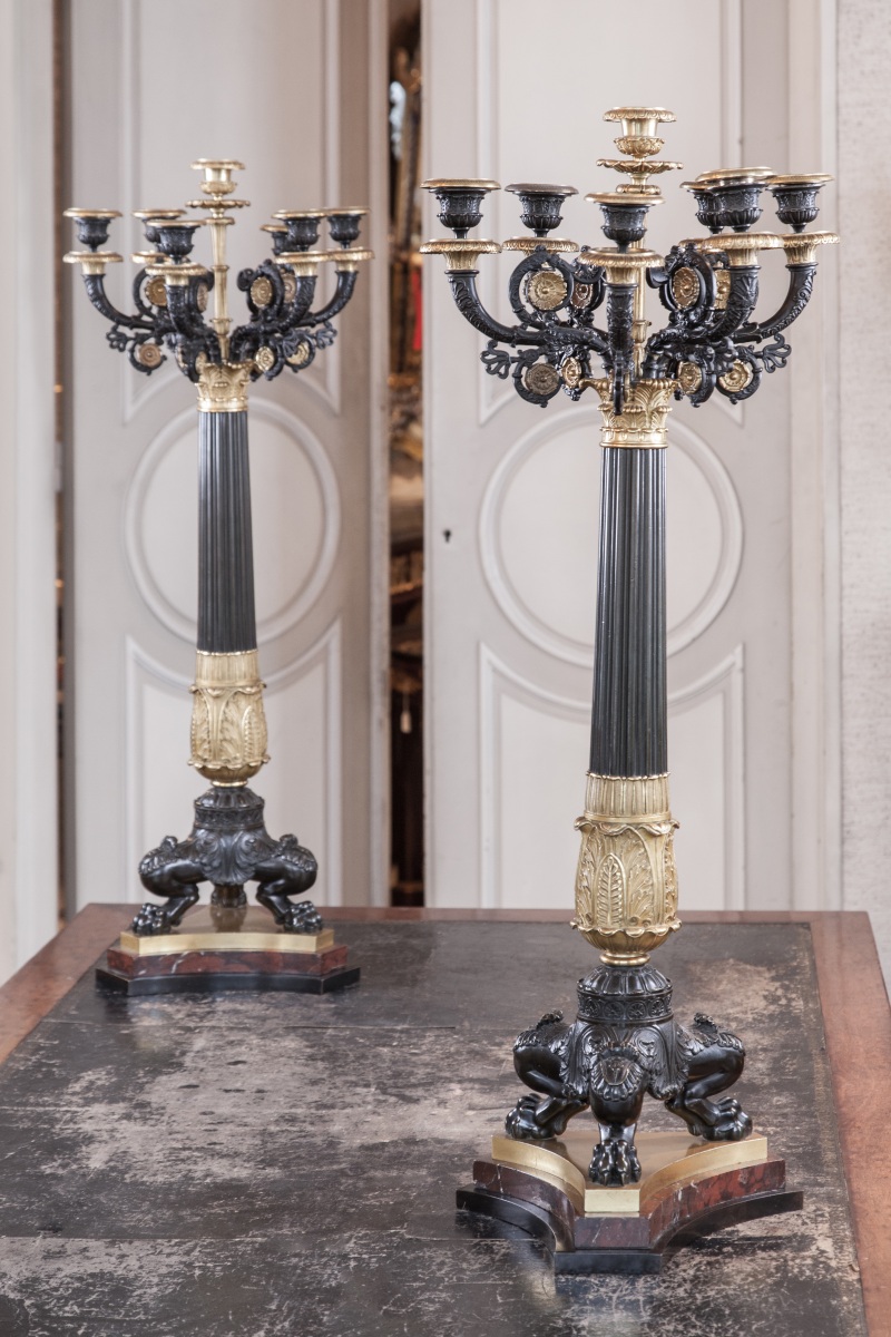 PAIRE d'importants CANDÉLABRES en bronze patiné et doré en forme de colonne godronné à bague et chapiteau, soutenant sept bras de lumière à volutes feuillagées. Bases tripodes à jarrets de lion sur un contre-socle de marbre griotte.