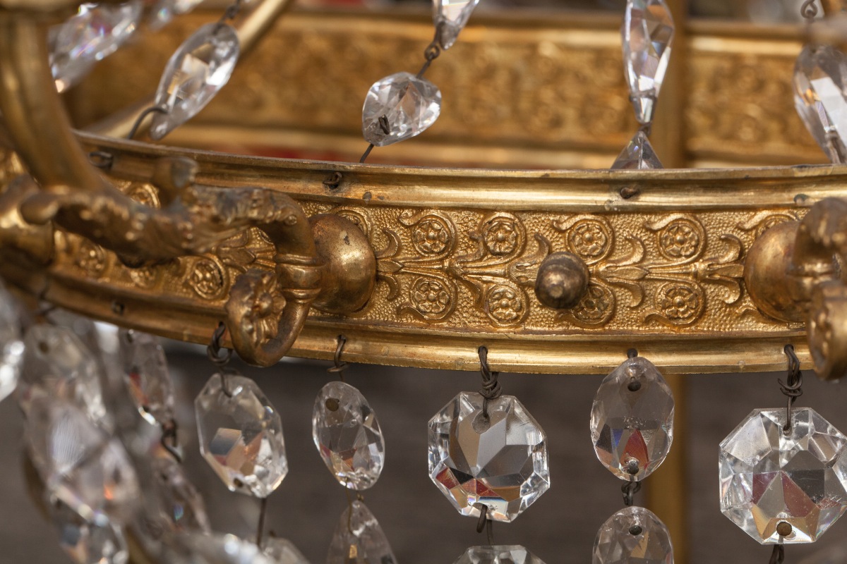 PAIRE de GIRANDOLES en demi-lustre corbeille en bronze doré à cinq lumières en corne d'abondance. Fût cannelé torsadé décoré à la molette.