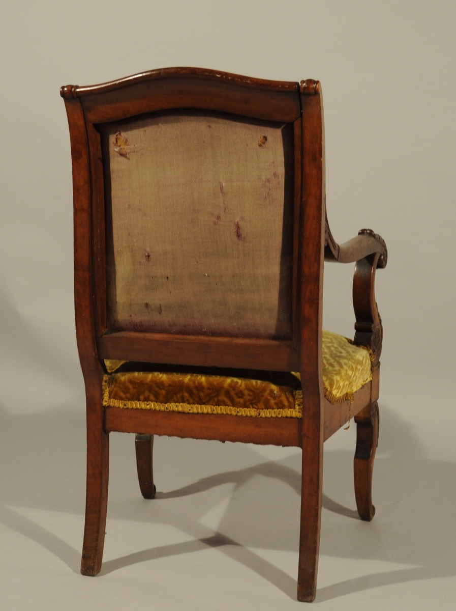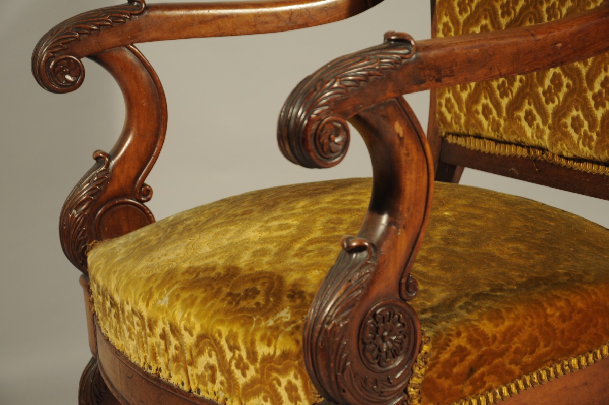 Paire de FAUTEUILS en acajou mouluré et sculpté. Accotoirs en crosse et supports d'accotoirs à enroulement fleuronné agrémentés de feuilles d'acanthe. Pieds antérieurs en jarret et pieds postérieurs en sabre.