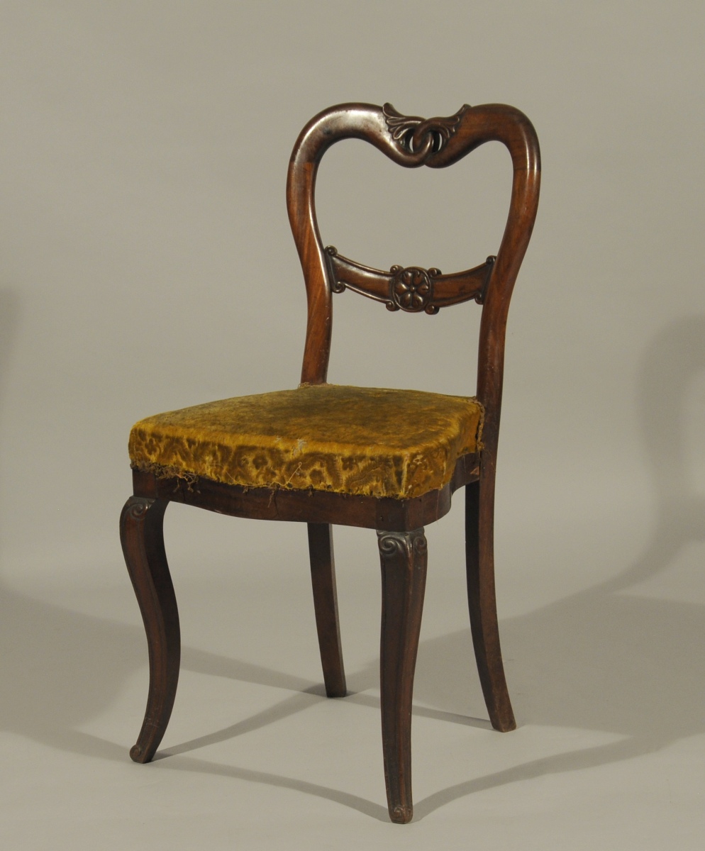 CHAISE en noyer mouluré et sculpté. Le dossier ajouré de tiges feuillagées enlacées. Traverse médiane centrée d'un fleuron. Pieds antérieurs à enroulements, pieds postérieurs en sabre.