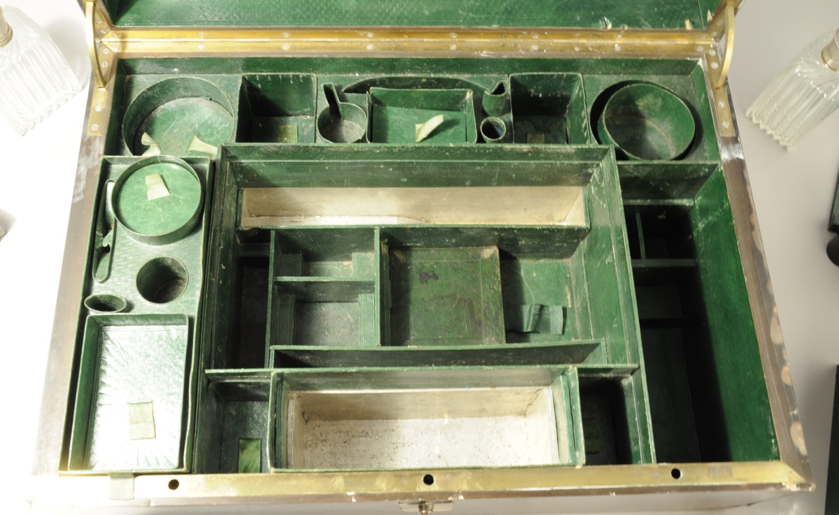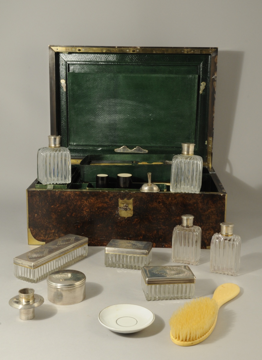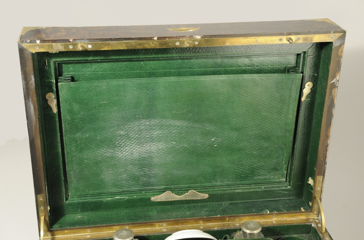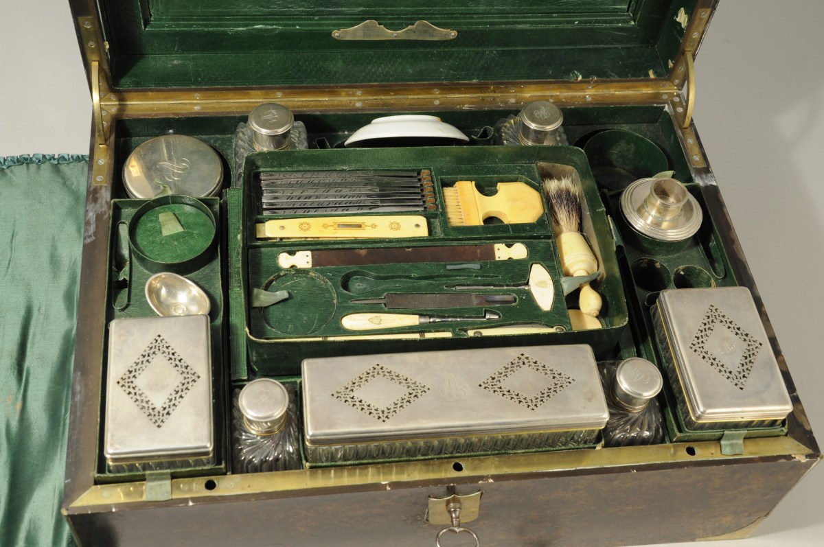COFFRET NÉCESSAIRE de VOYAGE pour homme, dans un coffret de forme rectangulaire en loupe d'amboine à garnitures de laiton. L'intérieur gainé de maroquin vert. Il comprend un ensemble de quatre flacons et de trois boîtes de formes diverses en cristal godronné et couvercles et bouchons d'argent monogrammés "AN"; une boîte de forme ronde en argent, une petite boîte en ivoire, deux boîtes tubulaires en ébène et ivoire, un rince-oeil, un bougeoir, un porte-montre en maroquin et une brosse, le manche en ivoire. Une multitude d'accessoires en acier et ivoire répartis sur quatre plateaux comprenant notamment une scie, deux canifs, un carnet de visites, un couteau multifonctions, un cure-dents, deux paires de ciseaux, deux pinces, trois limes, deux tournevis, un marteau, un tire-bouchon, une plume, un blaireau, une brosse, un rasoir à sept lames interchageables, un affûteur... L'intérieur du couvercle pourvu d'un porte-documents et d'un miroir amovible (glace manquante).