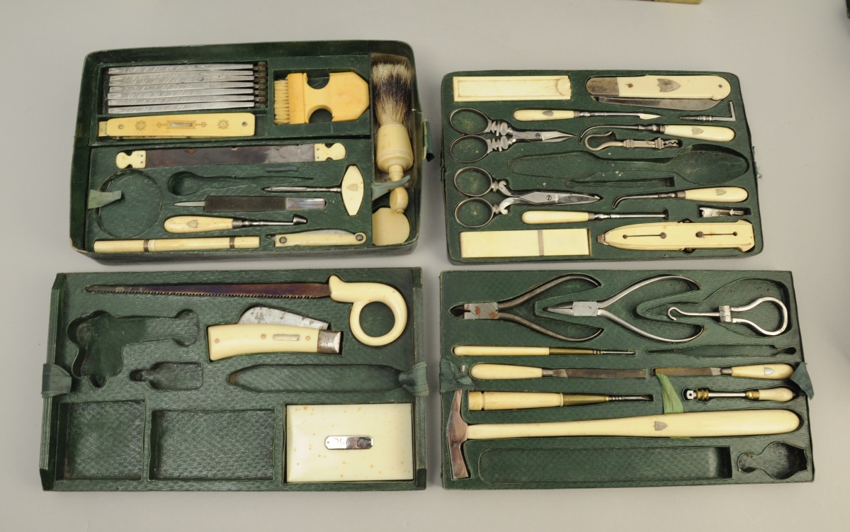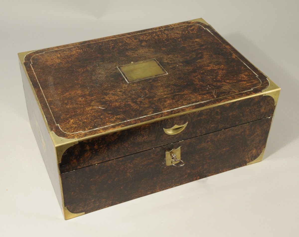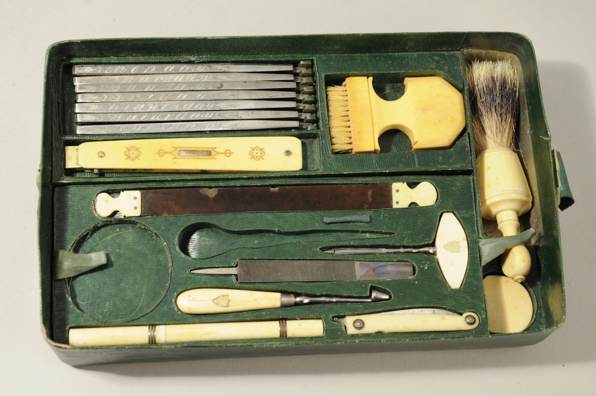 COFFRET NÉCESSAIRE de VOYAGE pour homme, dans un coffret de forme rectangulaire en loupe d'amboine à garnitures de laiton. L'intérieur gainé de maroquin vert. Il comprend un ensemble de quatre flacons et de trois boîtes de formes diverses en cristal godronné et couvercles et bouchons d'argent monogrammés "AN"; une boîte de forme ronde en argent, une petite boîte en ivoire, deux boîtes tubulaires en ébène et ivoire, un rince-oeil, un bougeoir, un porte-montre en maroquin et une brosse, le manche en ivoire. Une multitude d'accessoires en acier et ivoire répartis sur quatre plateaux comprenant notamment une scie, deux canifs, un carnet de visites, un couteau multifonctions, un cure-dents, deux paires de ciseaux, deux pinces, trois limes, deux tournevis, un marteau, un tire-bouchon, une plume, un blaireau, une brosse, un rasoir à sept lames interchageables, un affûteur... L'intérieur du couvercle pourvu d'un porte-documents et d'un miroir amovible (glace manquante).