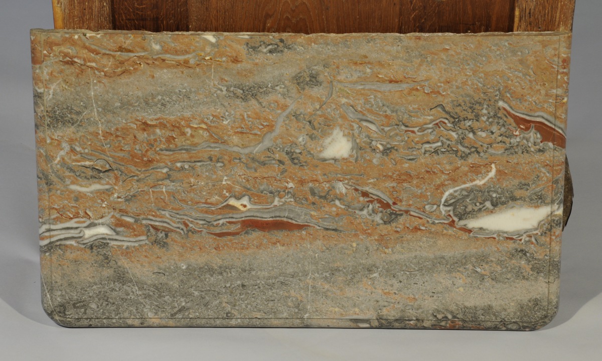 SECRÉTAIRE vertical de forme rectangulaire en placage de bois de rose et d'amarante. Il ouvre en façade par quatre tiroirs et un abattant découvrant un casier et quatre tiroirs. Marqueterie florale à cornes d'abondance dans des cartouches chantournés en façade. Les montants antérieurs à pans coupés. Repose sur quatre pieds cambrés. Garniture de bronzes feuillagés tels que entrées de serrure, chutes, tablier et sabots. Dessus de marbre rouge de Belgique.