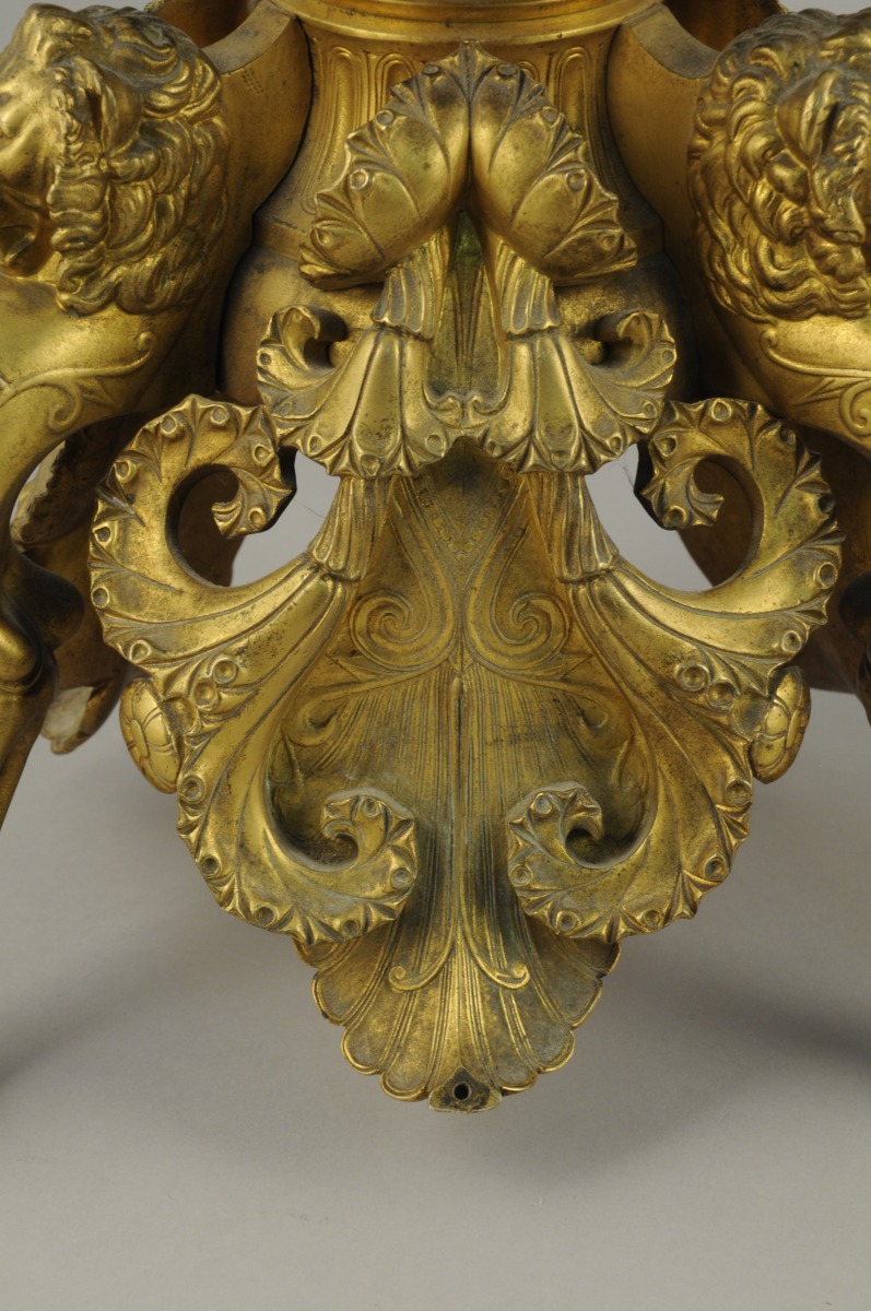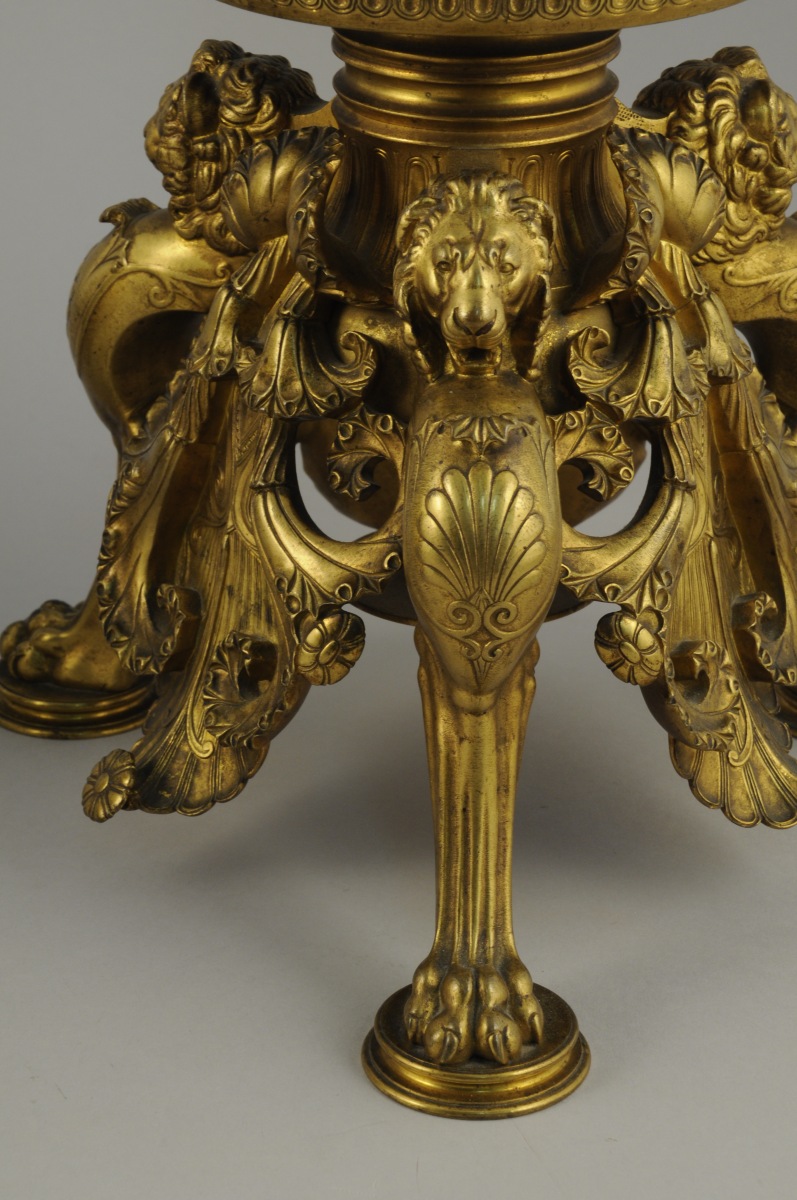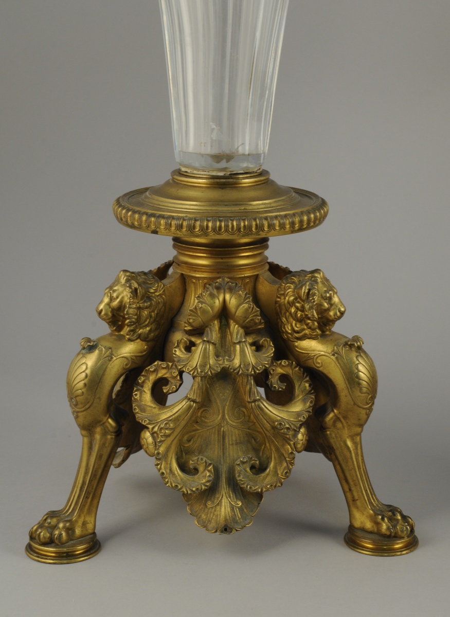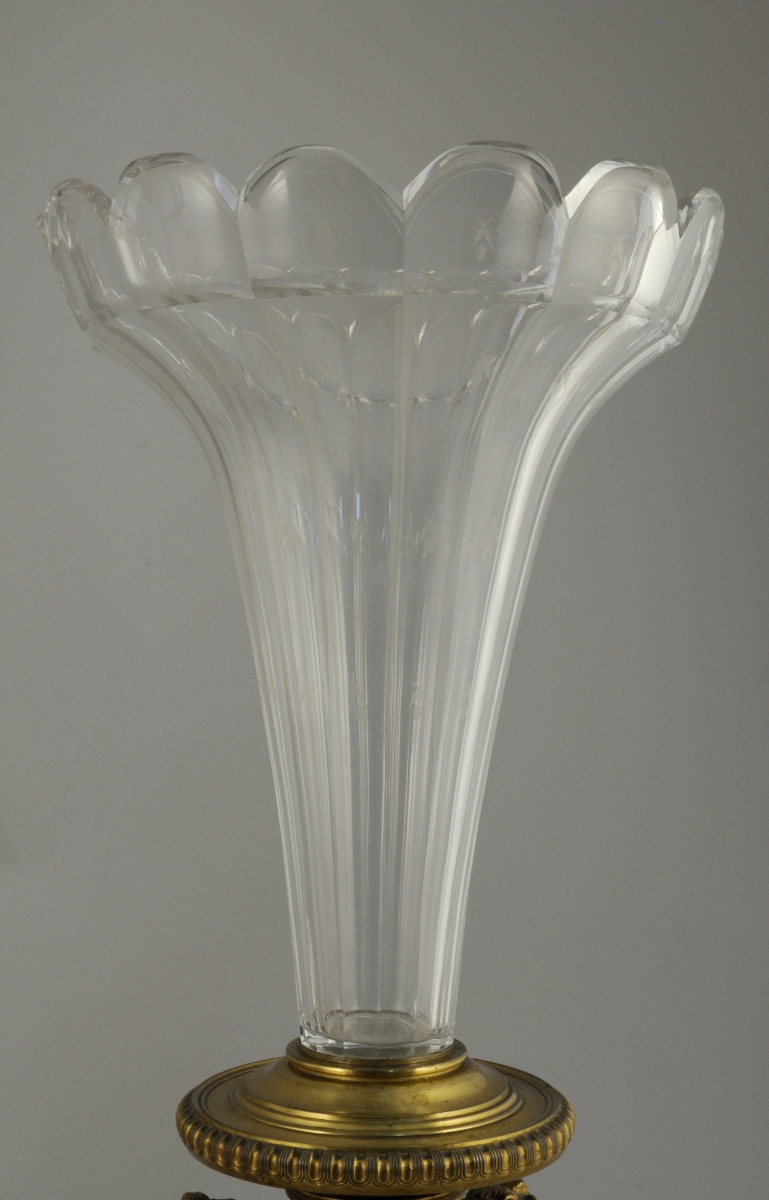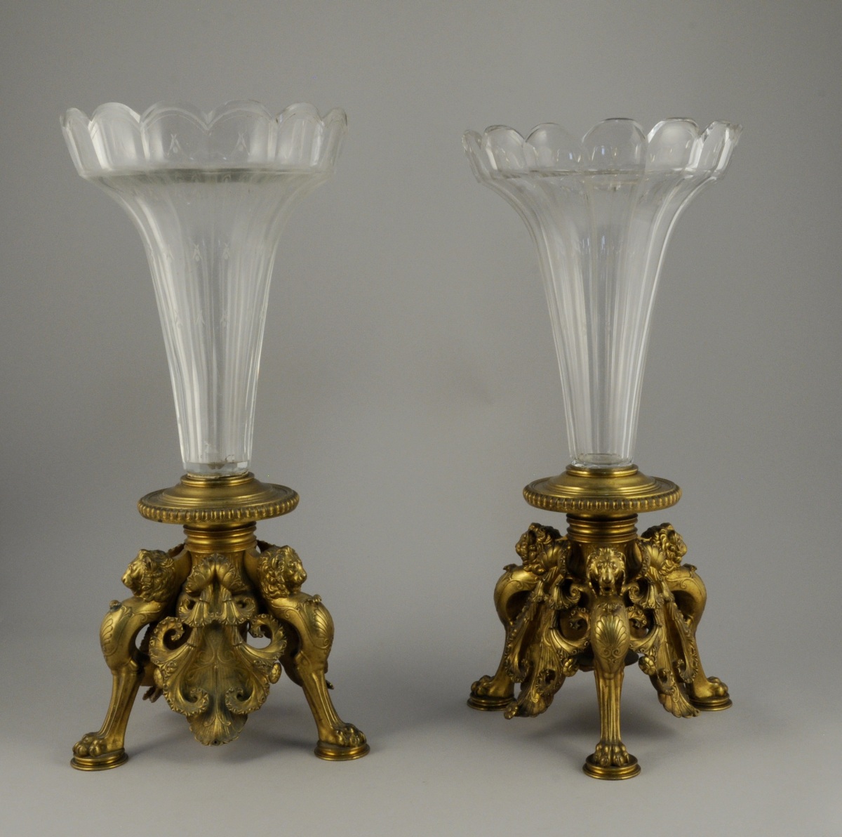 IMPORTANTE PAIRE DE VASES en cristal et bronze doré. Les vases corolle polylobés en cristal taillé reposent sur des athéniennes de bronze à jarrets griffe à tête de lion alternés de rinceaux. Modèle de Barbedienne ?