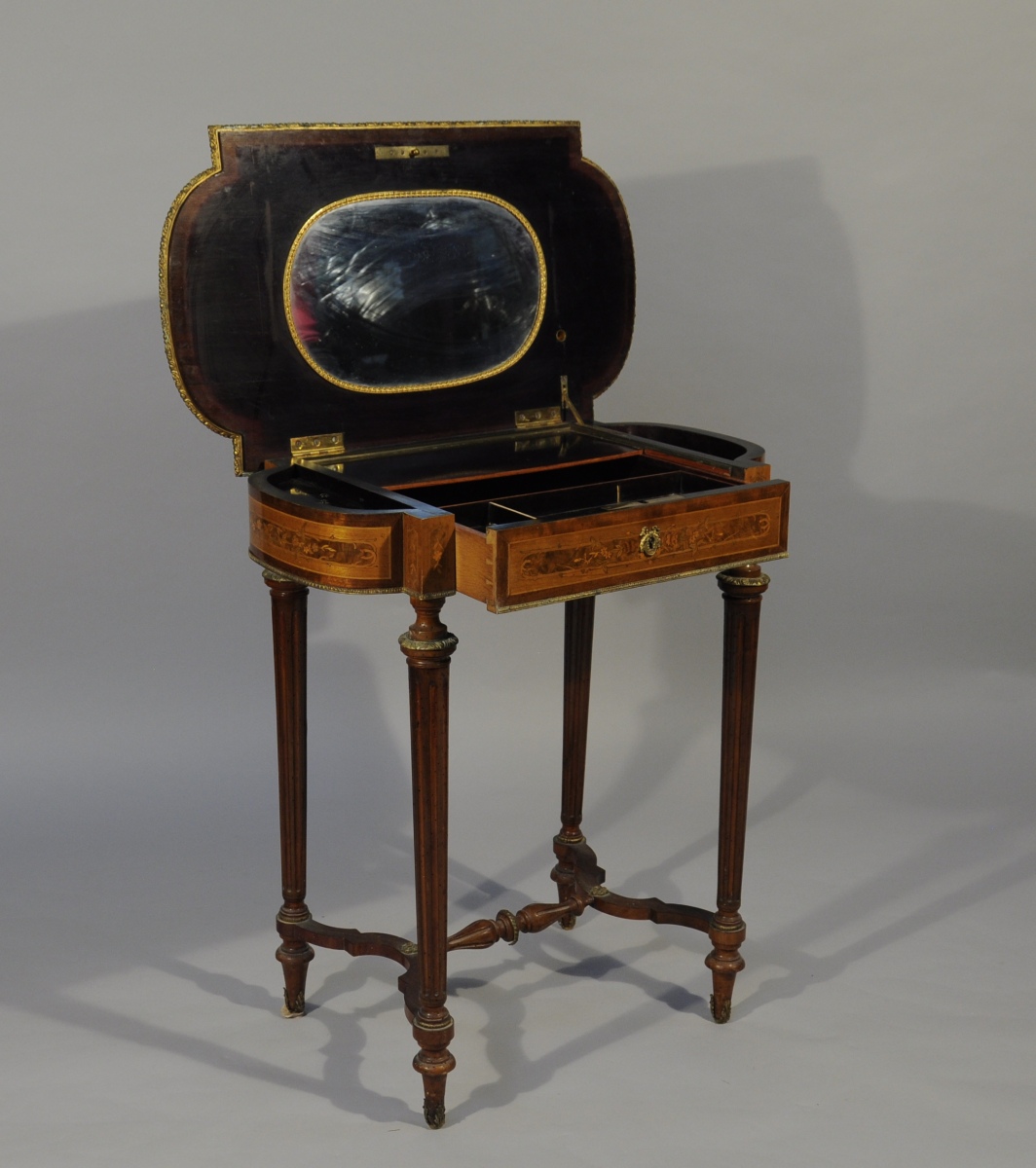 TABLE À OUVRAGE en bois de placage et marqueterie de bois de couleurs et teintés, toutes faces. Plateau basculant orné dans des entrelacs floraux en son centre d'une composition allégorique - foncé d'une glace au teint à l'intérieur. Ouvre par un tiroir. Piètement à cannelures réuni par une entretoise. Ornementation en bronzes : lingotière, bagues.
