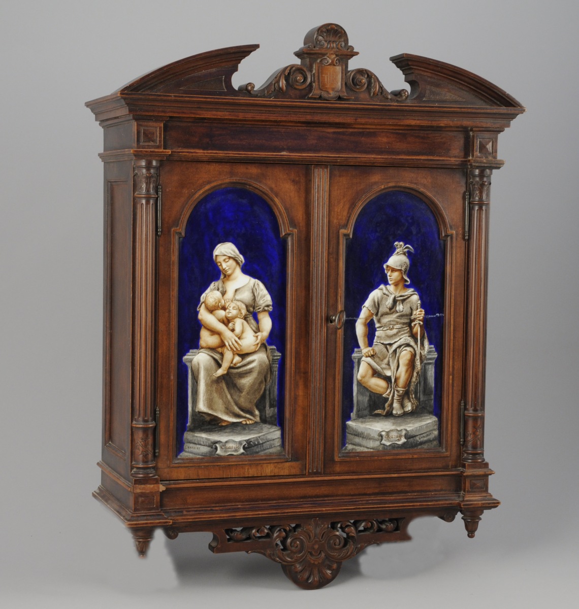 ARMOIRETTE-VITRINE en bois naturel de forme rectangulaire, à demi-colonne, fronton et base architecturés. Initiales JB. Elle ouvre à une double porte ornée de 2 plaques émaillées bleu représentant la "Charité" et le "Courage" en grisaille. Signées C VANDIER.
