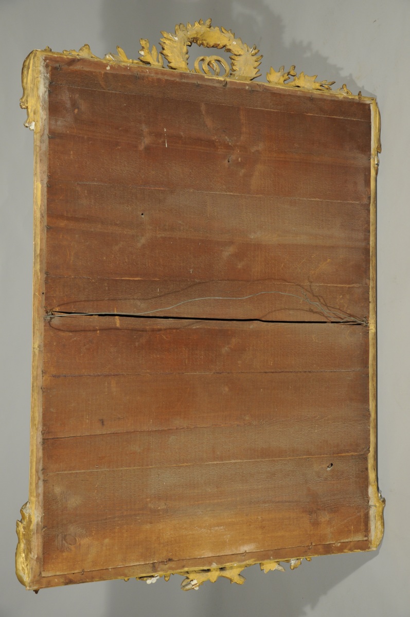MIROIR À FRONTON de forme rectangulaire à pares-closes en bois sculpté, stuqué et doré. Les glaces biseautées s'inscrivent dans des encadrements à riche décor de rais de perles, palmettes, frises de tournesols alternés de fleurons, feuilles d'acanthe stylisées et volutes. Le fronton finement ajouré d'une couronne d'olivier nouée.