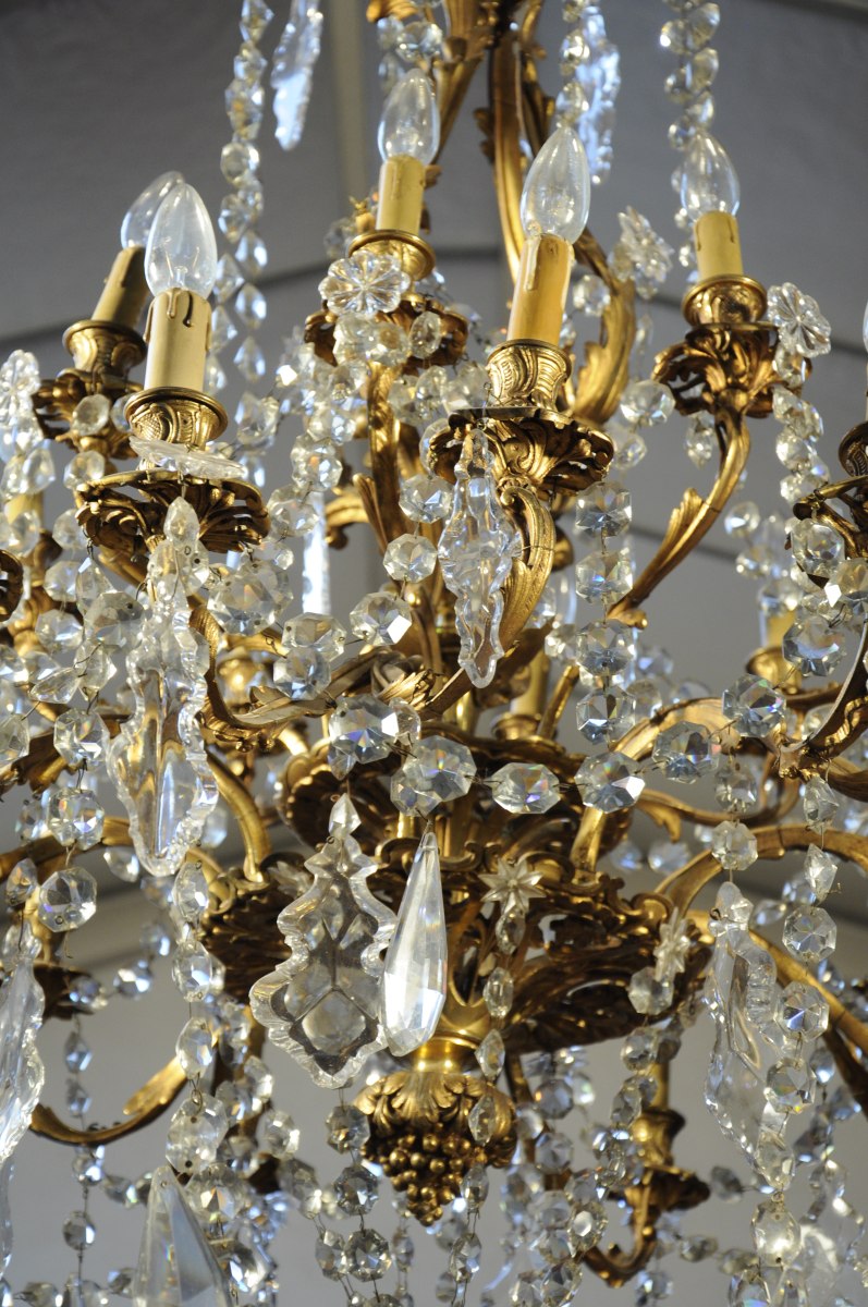 Important LUSTRE à 24 lumières en bronze doré et pampilles de cristal. Les bras de lumières chantournés répartis sur deux rangs adoptent la forme de feuilles d'acanthe stylisées. Fût à deux plateaux ajourés de feuillages terminé par une graine.