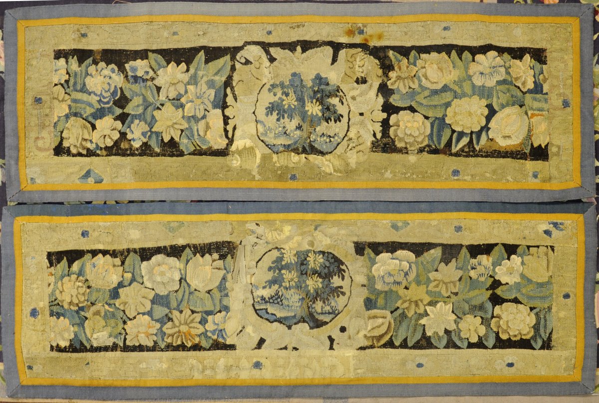 AUBUSSON. Deux fragments de bordure de TAPISSERIE en laine. Ils sont ornés, au centre, d'un médaillon paysagé flanqué de feuillages fleuris.