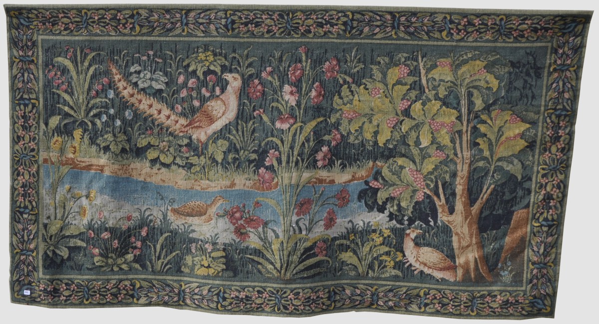 BORD DE L'EAU. Réplique tissée d'une TAPISSERIE du XVe siècle par l'atelier Robert Four (41 rue de Richelieu à Paris), tombée de métier n°91. 112 x 206 cm.