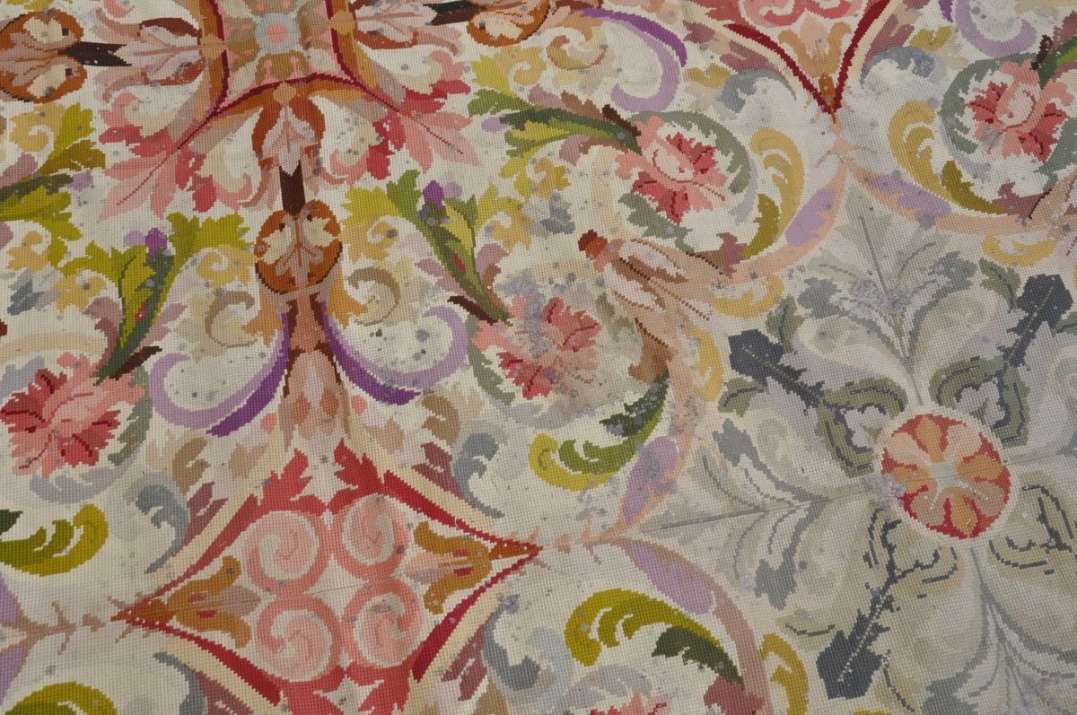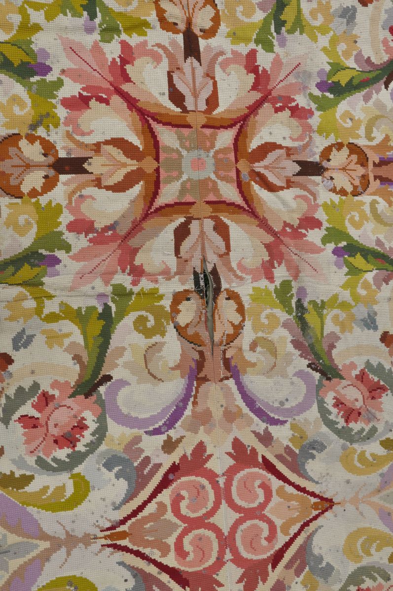 EUROPE (?) TAPIS au point noué canevas, à dominante bleu rose vert sur fond crème, à décor floral et d'acanthes. Larges bordures sur 3 côtés.