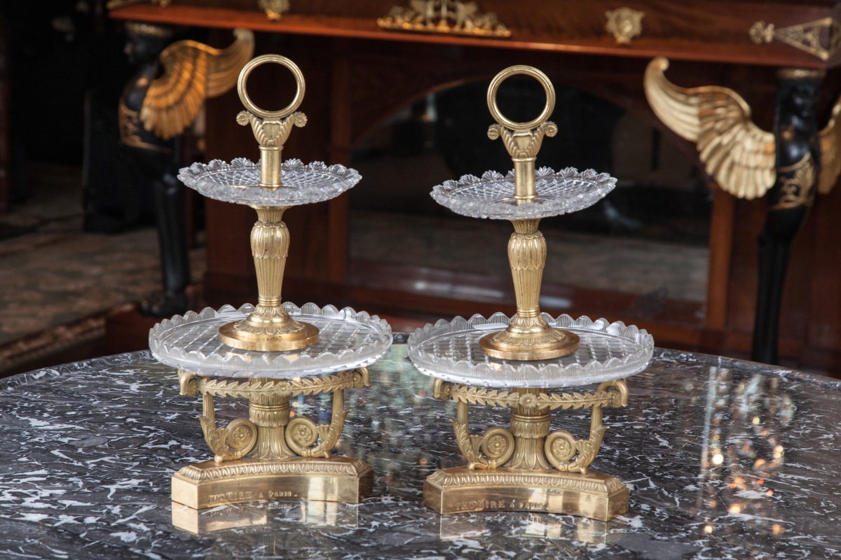 PAIRE de PRÉSENTOIRS en bronze doré à deux coupes en cristal taillé, ornés de feuilles lancéolées et rais de cur. Bases triangulaires échancrées à trois consoles inversées à enroulements.