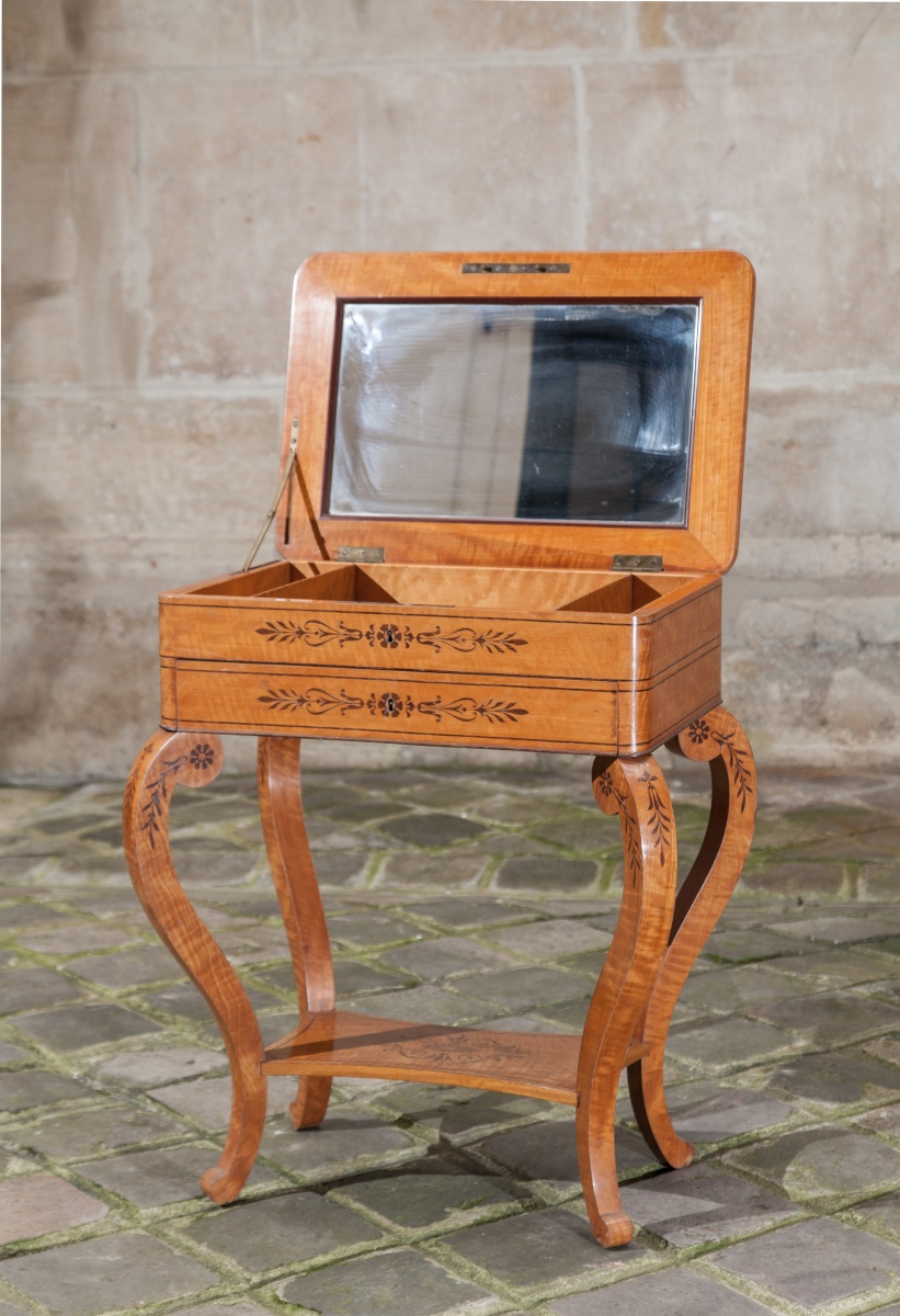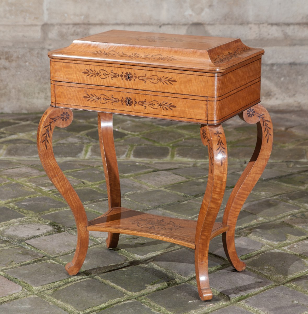 TABLE TRAVAILLEUSE à doucine renversée en placage de citronnier et érable moucheté à décor marqueté en amarante de filets, palmettes et fleurons. Plateau ouvrant garni d'un miroir découvrant des casiers. Un tiroir à façade. Montants sinueux à tablette d'entretoise.
